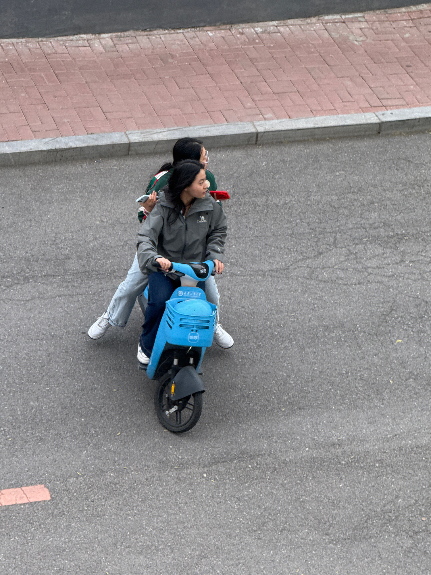 An overhead shot depicts two individuals riding a blue e-bike on an asphalt road in Zhongtun, China. The person in front is operating the vehicle. The passenger behind is positioned closely behind the…read more