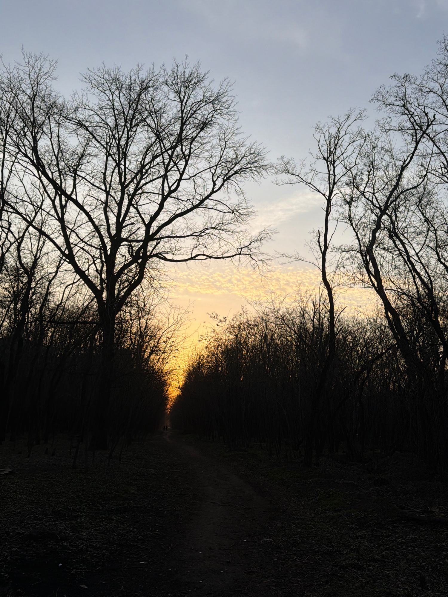 The image displays a dirt path bisecting a leafless wooded area in Rostov-on-Don, Russia, at either sunrise or sunset. The path extends centrally into the background, where an intense orange-yellow gl…read more