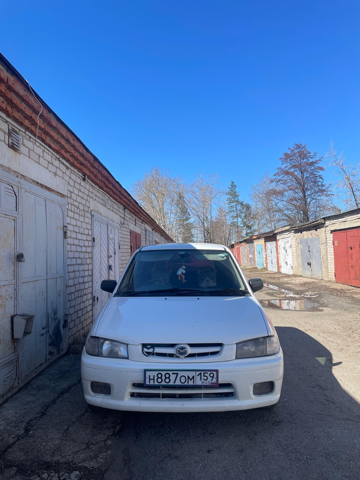 The image shows a white car parked on an asphalt road in what appears to be a garage area in Chaikovsky, Russia. The car's license plate is visible and reads "H887OM 159 RUS". On the left side of the…read more