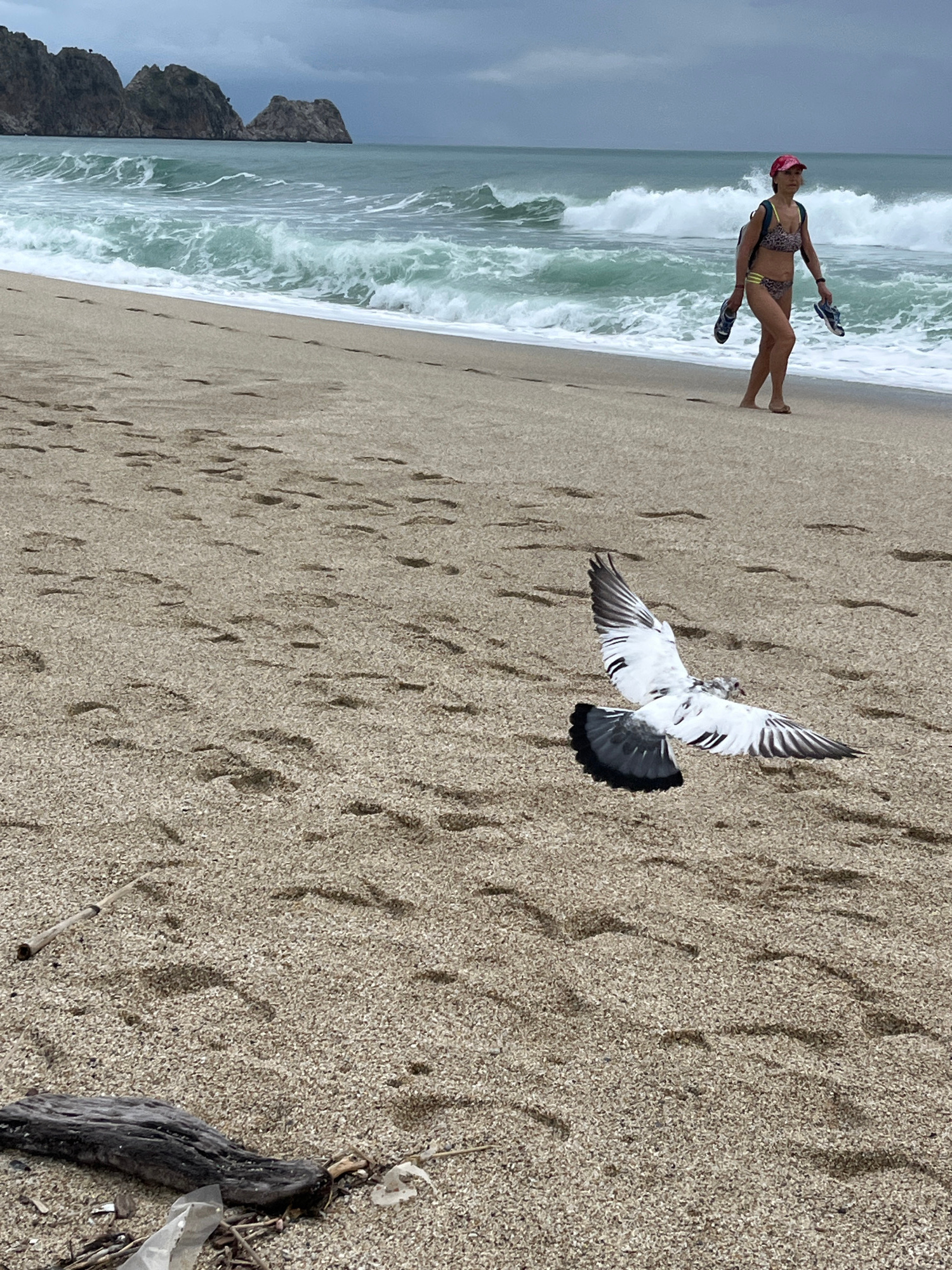 The image depicts a beach scene in Alanya, Turkey. A woman in a bikini and pink cap is walking near the shoreline, holding sandals in both hands. The ocean waves are crashing behind her. In the foregr…read more