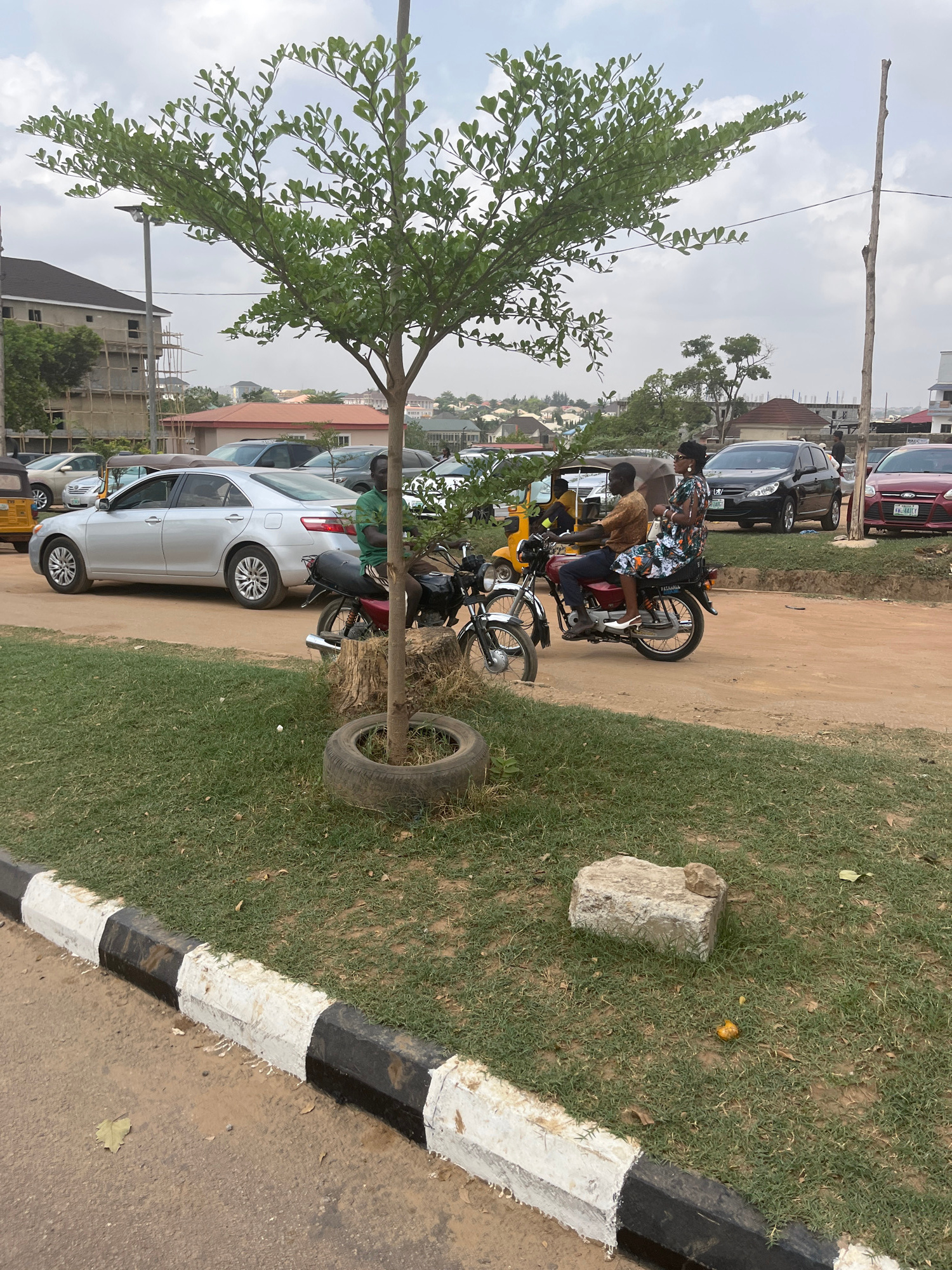 The image shows a street scene in Abuja, Nigeria. Several cars are parked along a dirt road, with a mix of vehicles including a silver sedan and a black Ford. A small tree stands next to the road, wit…read more