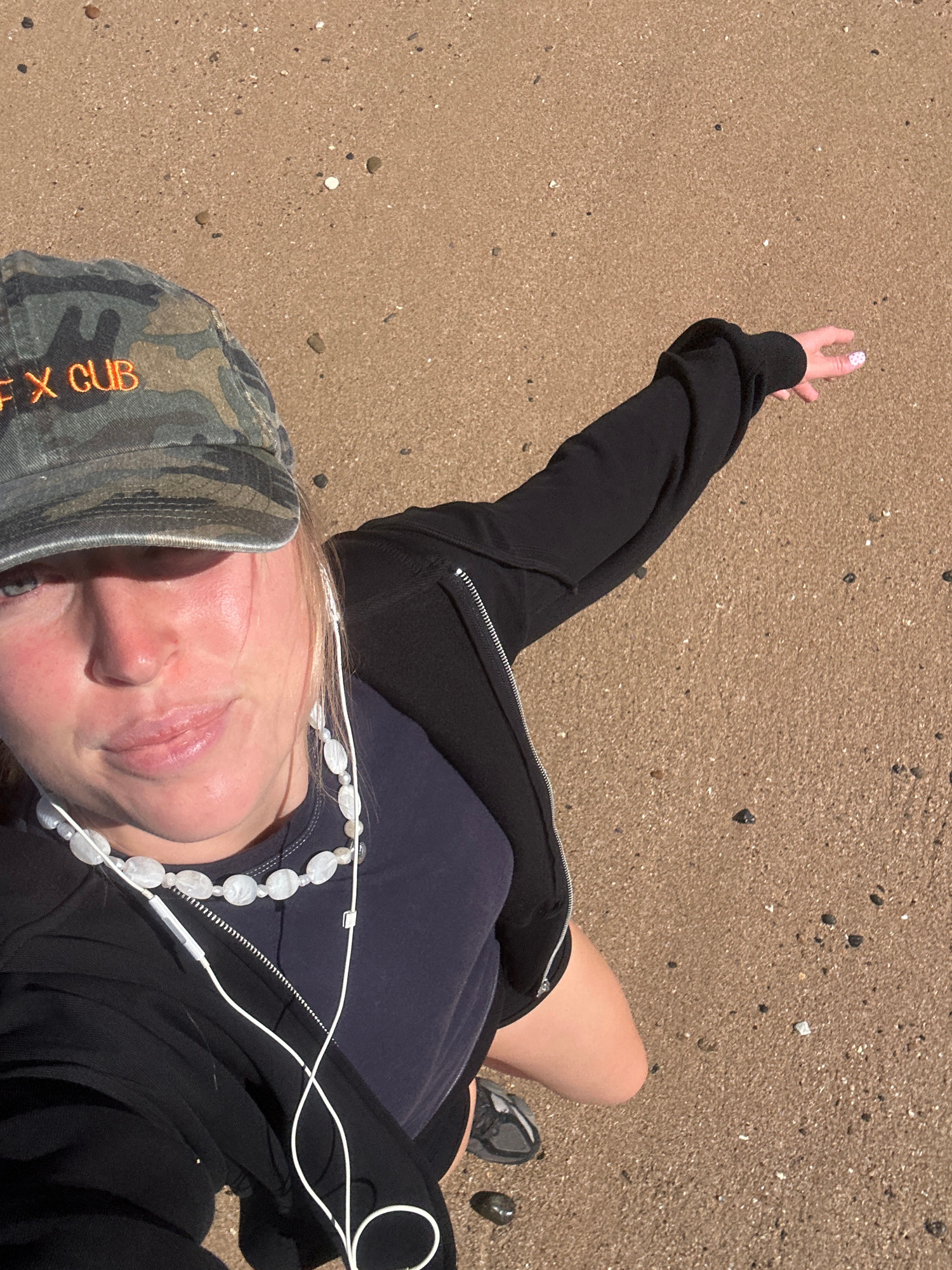 A high-angle, close-up photograph shows a person standing on a sandy beach, potentially in Bulli, Australia. The person is wearing a black zip-up jacket, a dark blue shirt, and a camouflage-patterned…read more