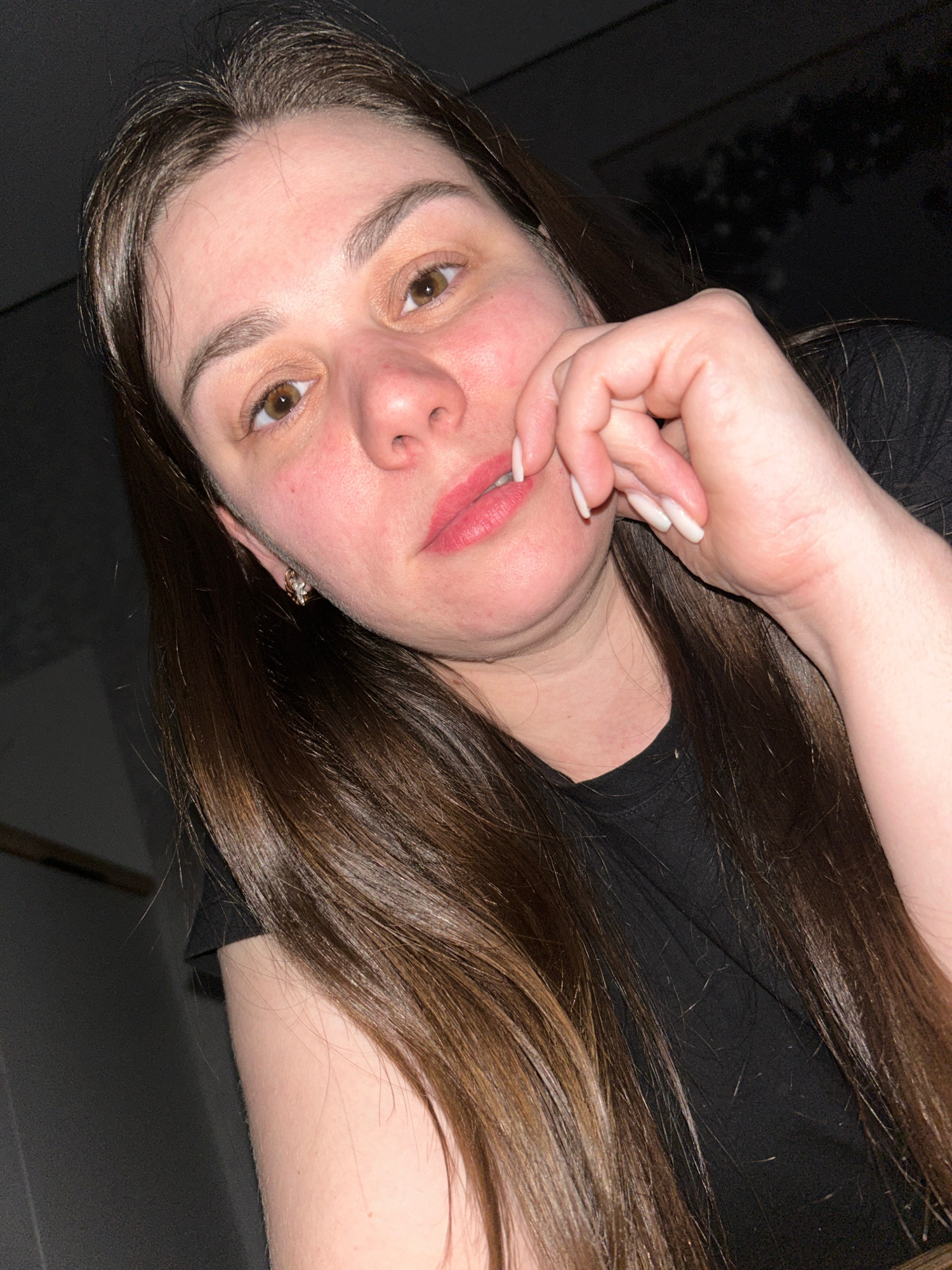 A medium close-up shot depicts a woman with light skin and light brown hair. She is wearing a black shirt. Her face is slightly flushed, and she has brown eyes and pink lipstick. Her right hand is rai…read more