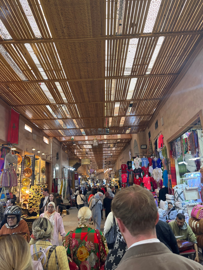 The image depicts a crowded indoor market, specifically a souk, in the city of Marrakesh, Morocco. The scene is a long, narrow passageway lined with open-fronted shops on both sides, extending deep in…read more