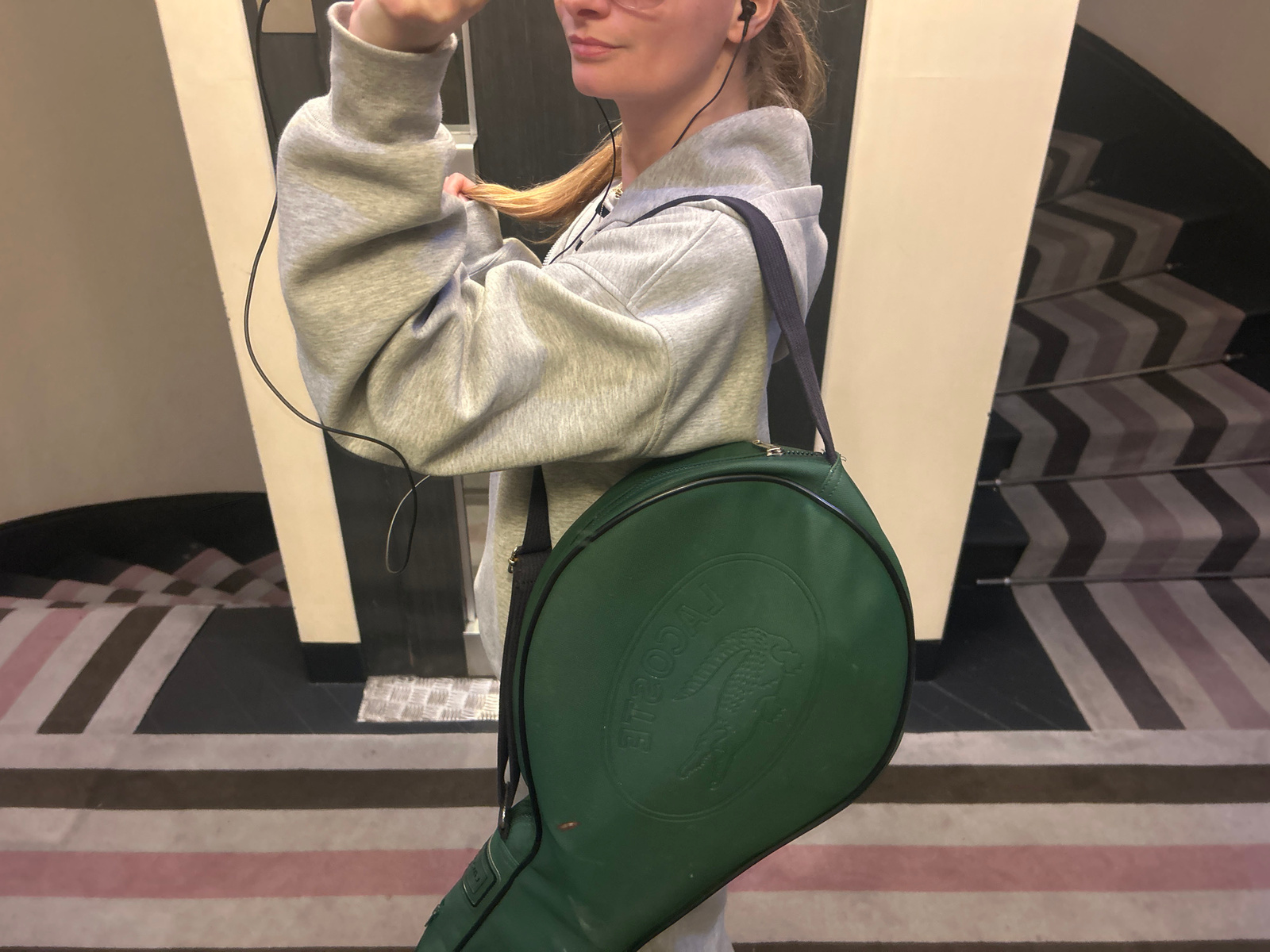 A person is carrying a green Lacoste tennis racket bag. The person is wearing a grey hoodie with a blue strap and headphones. The location is an interior space featuring a wall or ceiling with striped…read more