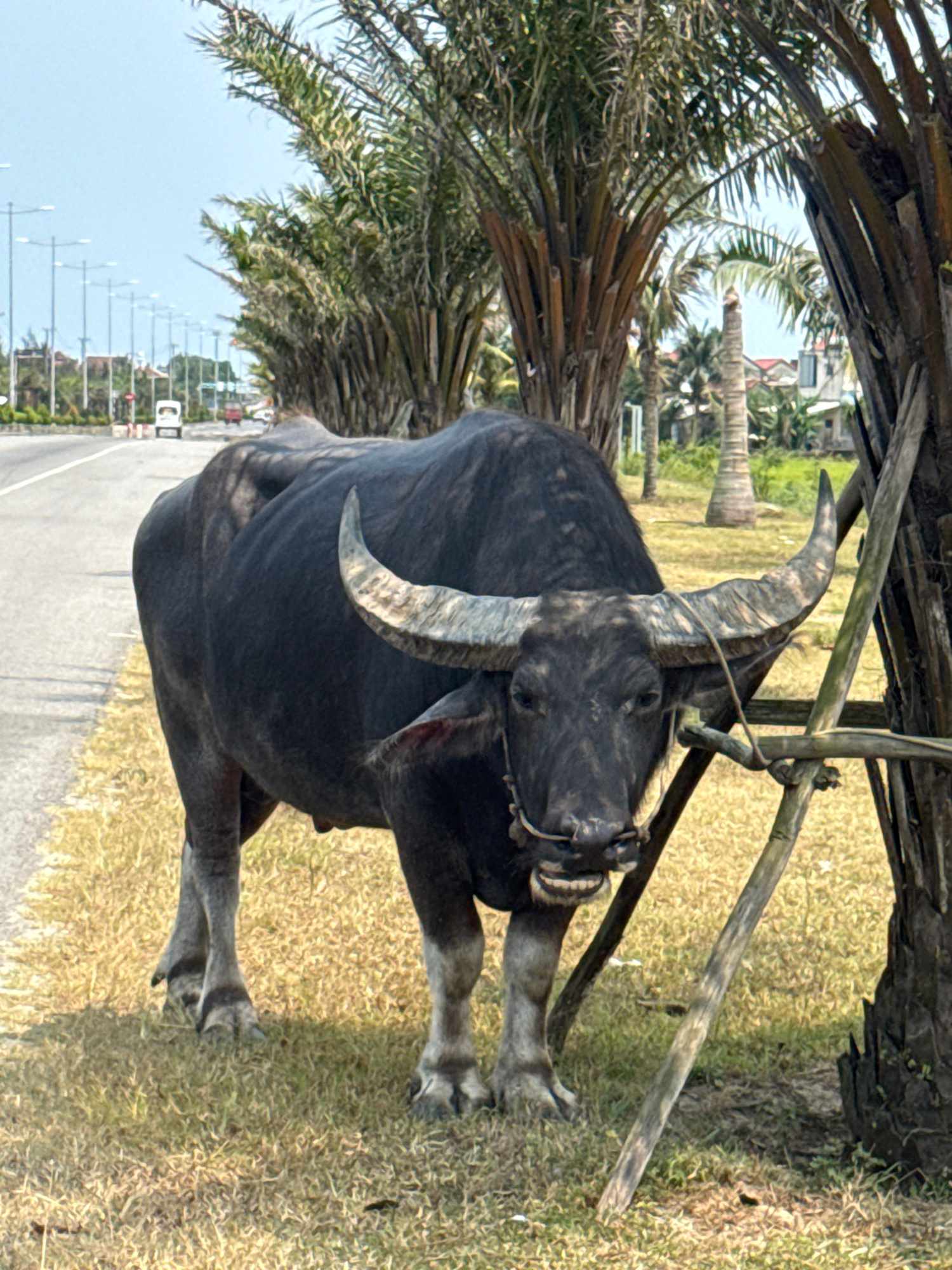 The image, oriented horizontally, depicts a large water buffalo standing on dry, yellowish-green grass next to an asphalt road, likely in Đà Nẵng, Vietnam. The buffalo is dark grey to black, with prom…read more