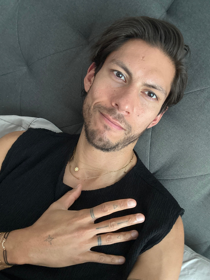 A man with light skin and dark hair lies on a gray surface, possibly a couch. He has stubble and is gazing directly at the camera. He wears a black, textured sleeveless shirt and gold necklaces. His r…read more