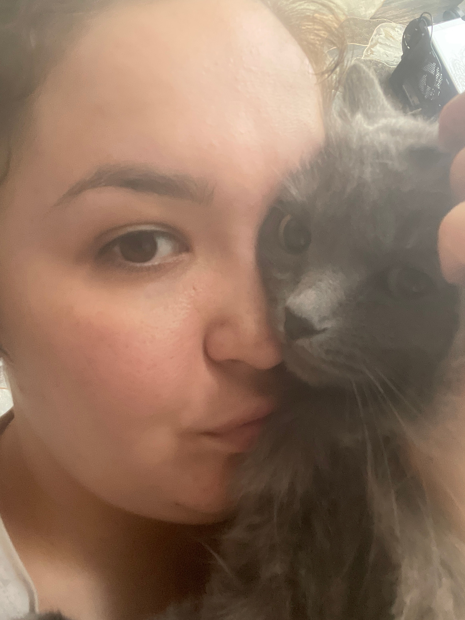 A close-up indoor photograph shows a person lying down with a gray cat nestled close to their face. The person is fair-skinned with an eye visible. The cat is gray with short fur and is positioned suc…read more