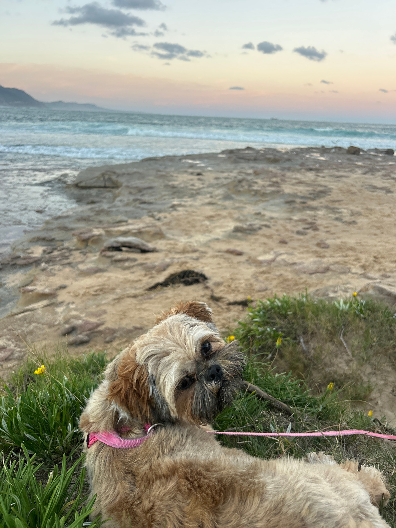 A medium, eye-level, sideways oriented shot features a Shih Tzu dog at the beach. The dog is tan and brown with long, scruffy hair covering its face and wears a pink collar. The dog is attached to a p…read more
