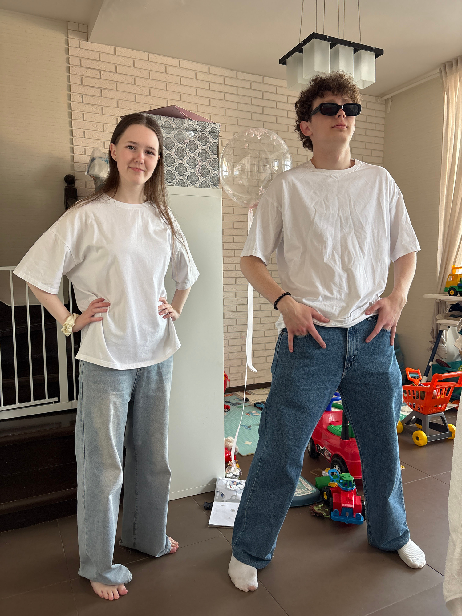 Two individuals, a male and a female, are posing indoors for a photo. The male, positioned in the upper part of the frame, has curly hair and wears sunglasses, a white t-shirt, blue jeans, and a black…read more