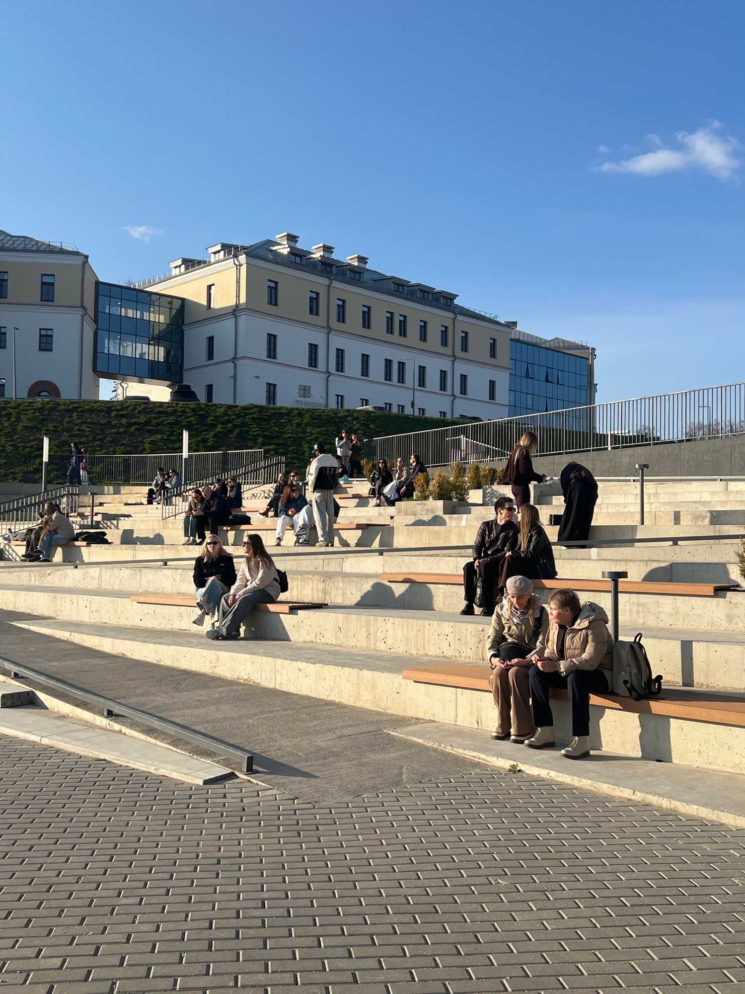 People are sitting on outdoor steps in what appears to be a public space. The steps have wooden benches attached to them. A modern building is visible in the background. The clear blue sky indicates f…read more