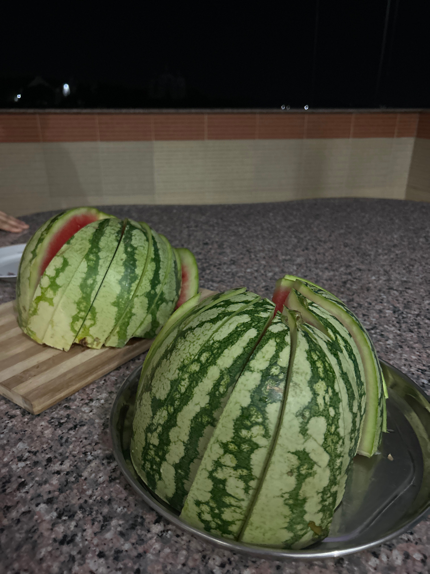 A partially-sliced watermelon sits on a silver tray and a wooden cutting board on a countertop of speckled granite. A partially-sliced watermelon sits on a wooden cutting board. Adjacent to the counte…read more