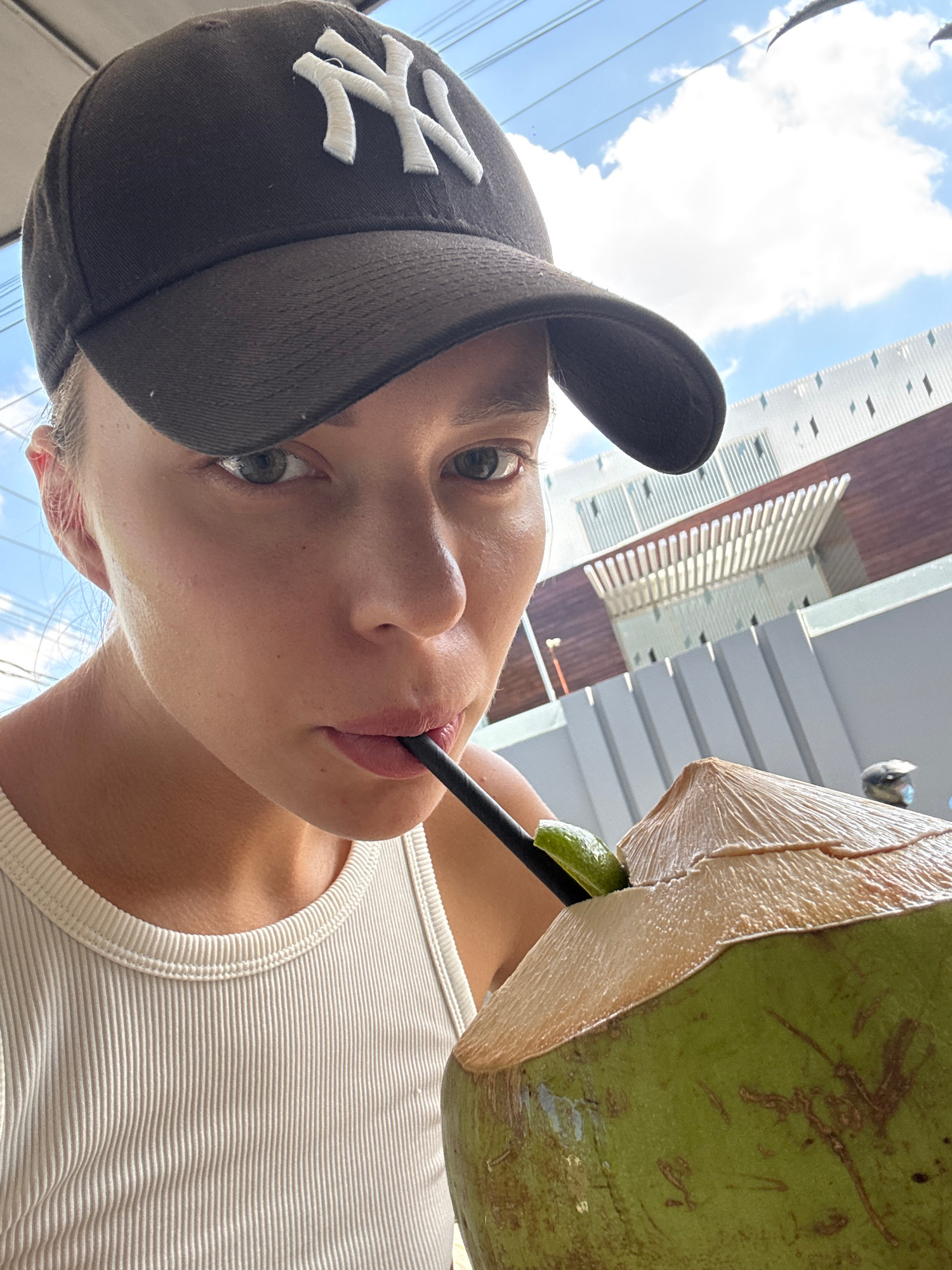 A young woman wearing a baseball cap with the New York Yankees logo and a white ribbed tank top is drinking from a fresh coconut with a black straw and a wedge of lime. She is standing outside with a…read more