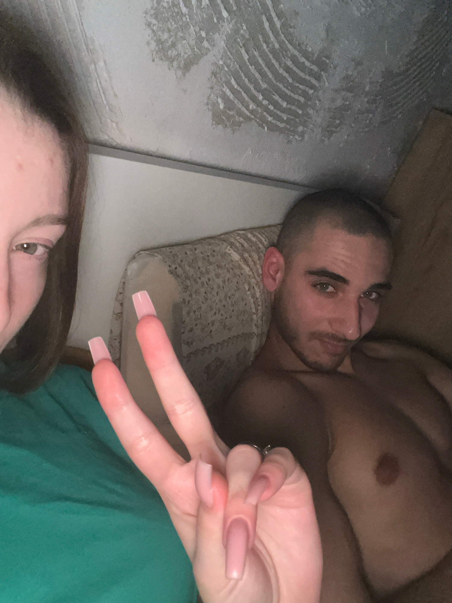A selfie captures a shirtless man with a shaved head lying on a patterned pillow and gazing at the camera. Beside him, a woman partially visible in the lower frame, displaying a peace sign with her ha…read more