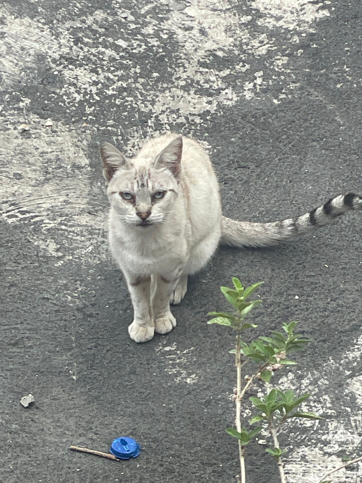 A feline with a light gray coat and darker gray stripes on its tail lies on a textured gray surface, possibly concrete or asphalt. The cat is looking up towards the camera. To the right, a green brancβ¦read more