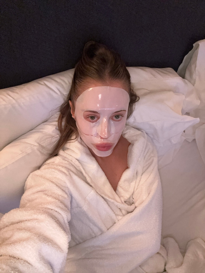 A female subject, approximately 20-30 years of age, is depicted lying on her back in a bed within a residential or hotel bedroom, location Unknown, Unknown. She is wearing a white terrycloth bathrobe…read more