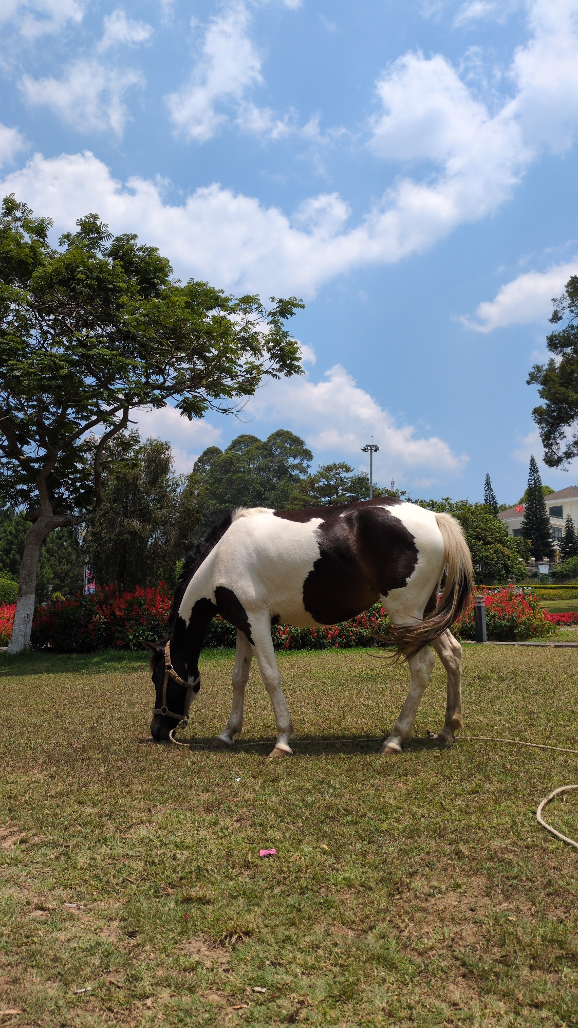 The scene is an outdoor setting, possibly a park or grassy area, in Da Lat, Vietnam. The focal point is a horse, predominantly white with large brown patches, grazing on the grass. The horse has a lig…read more
