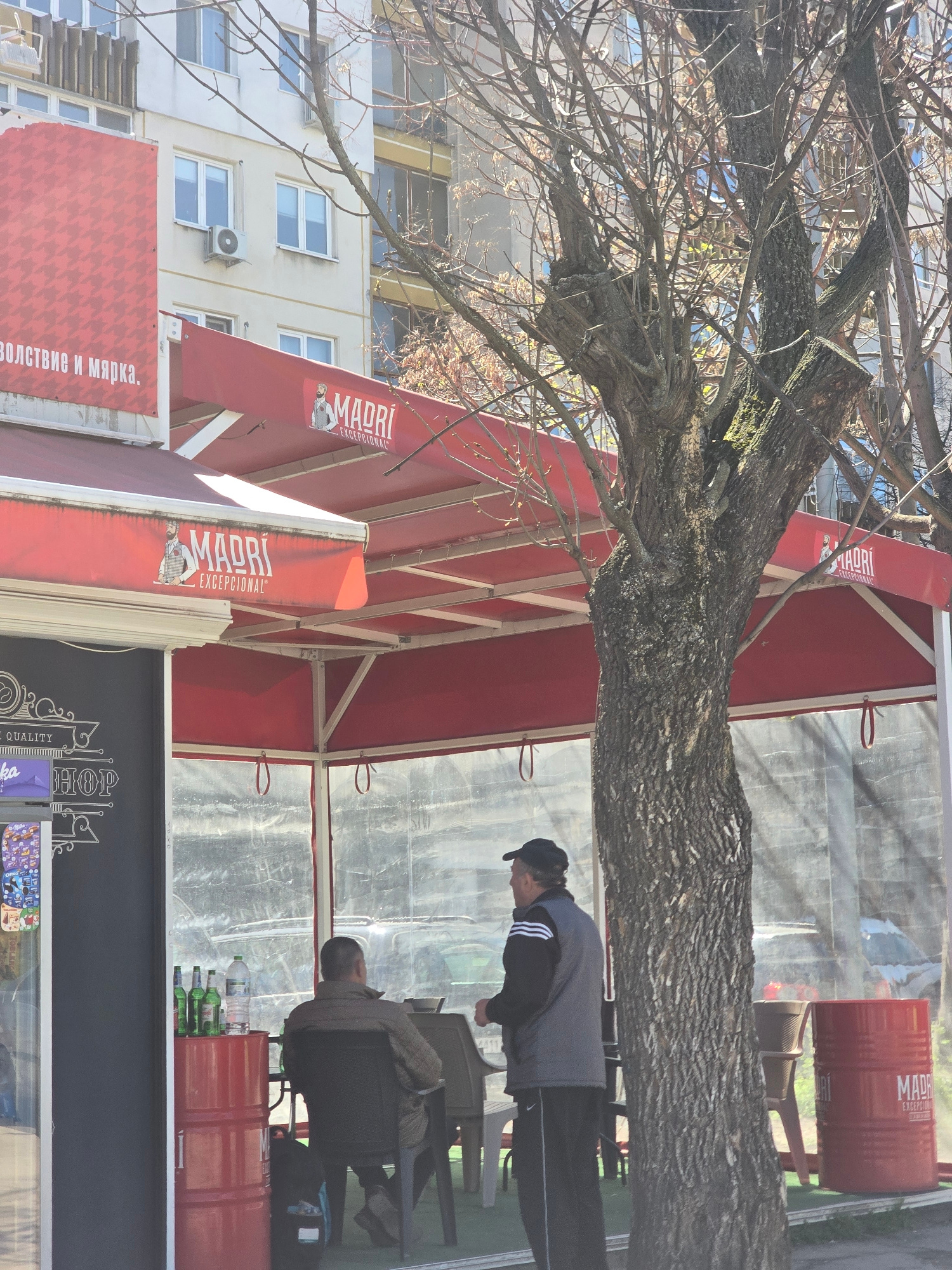 The image shows an outdoor café in Plovdiv, Bulgaria. A tree with bare branches extends over the café. The café has a red awning with the name "MADRÍ EXCEPCIONAL" on it. Under the awning, two men are…read more