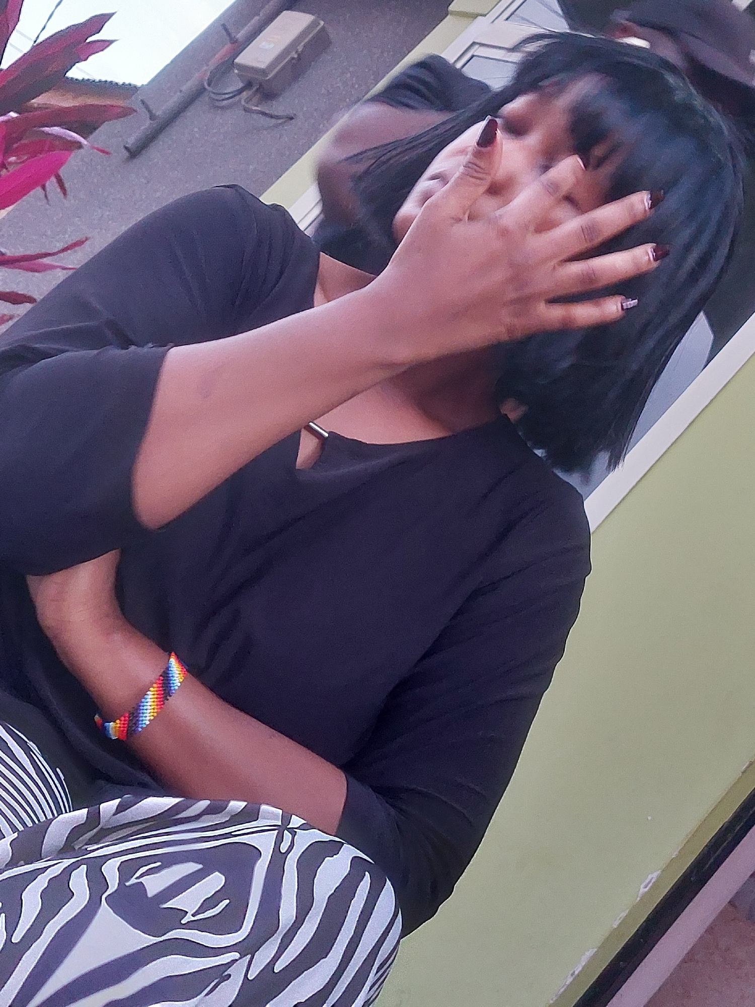 A person is sitting outdoors in Dar es-Salaam, Tanzania. The individual, who appears to be a woman, has dark hair with bangs, dark nail polish, and a dark-colored shirt. She is partially obscuring her…read more
