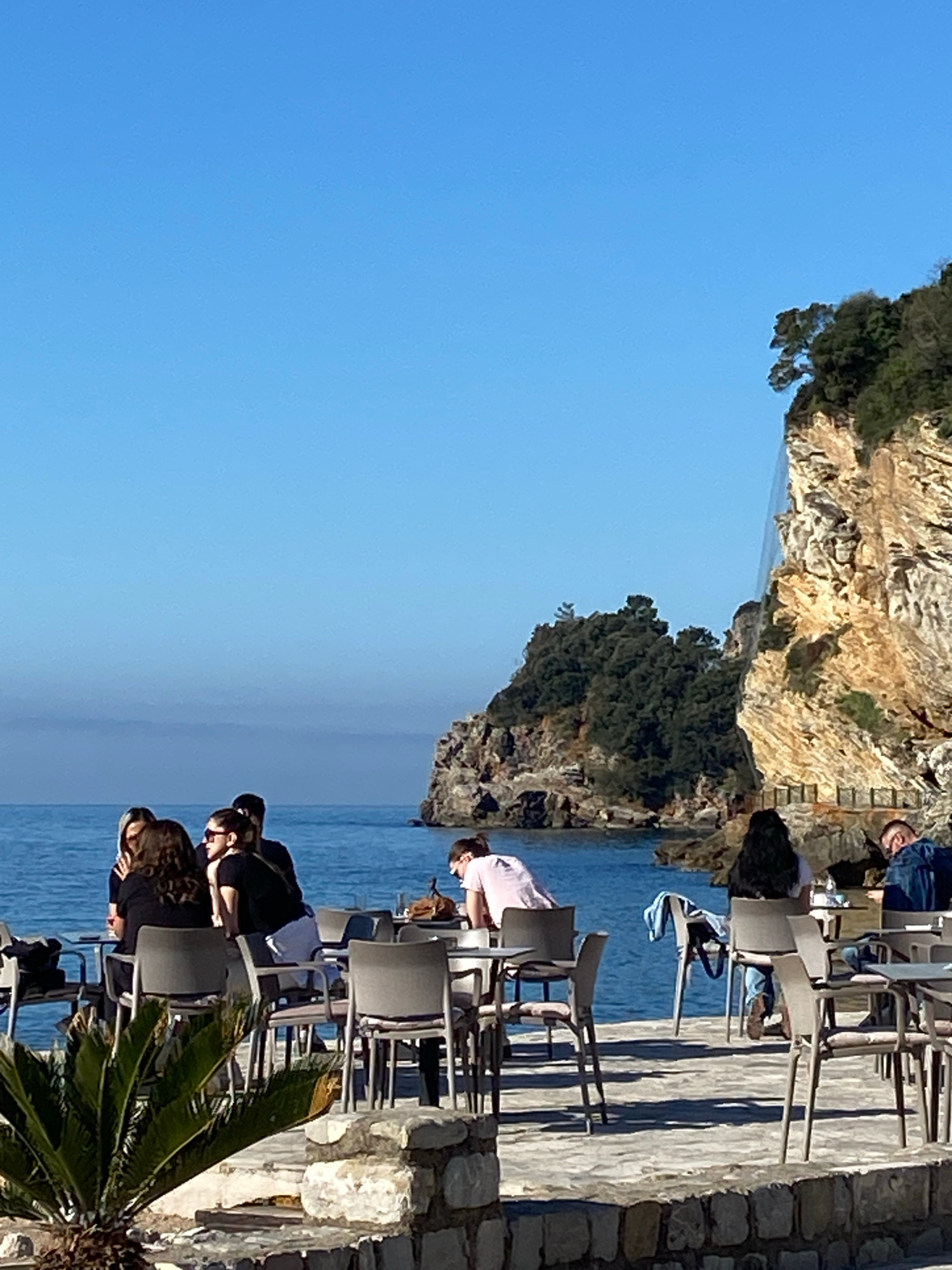 Here is a description of the image: The image depicts an outdoor scene, likely a café or restaurant terrace, in the city of Budva, Montenegro. Several people are sitting at tables and chairs, enjoyin…read more