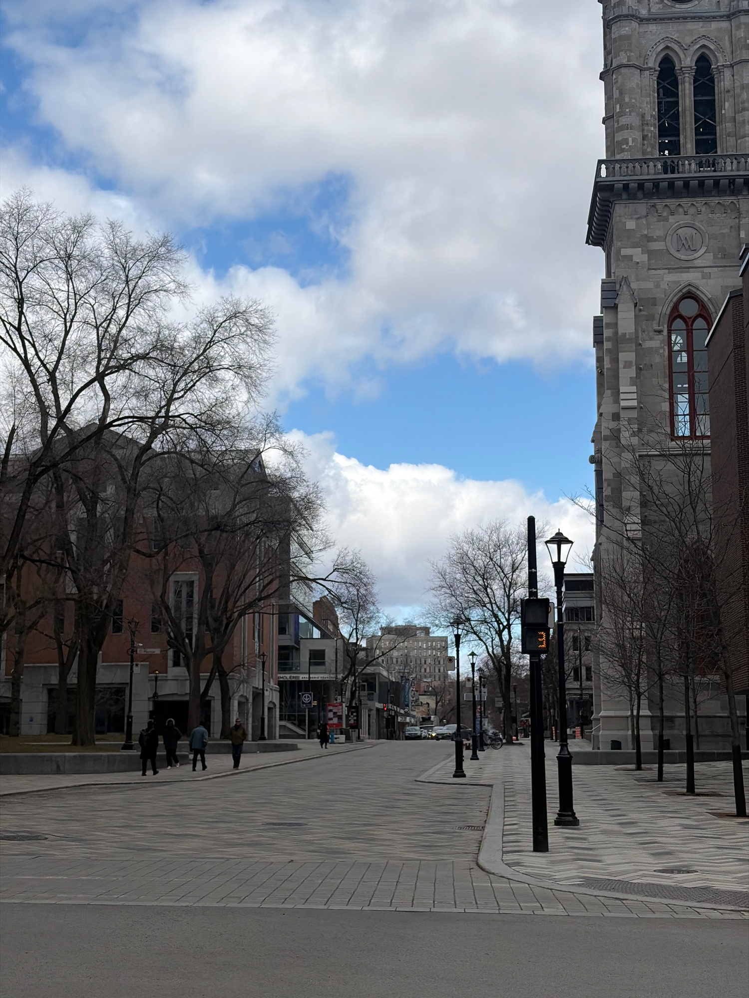 The image shows a street scene in Montreal, Canada, with a view along the sidewalk and street towards the horizon. The architecture is a mix of older stone buildings and more modern brick and glass st…read more