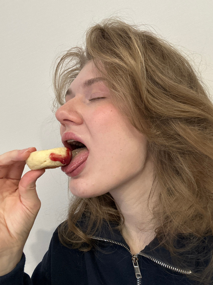 A fair-skinned person with wavy, light brown hair, eyes closed, and head tilted, is captured from a low-angle perspective. The individual is in the act of eating. The tongue is extended, coming into cā¦read more