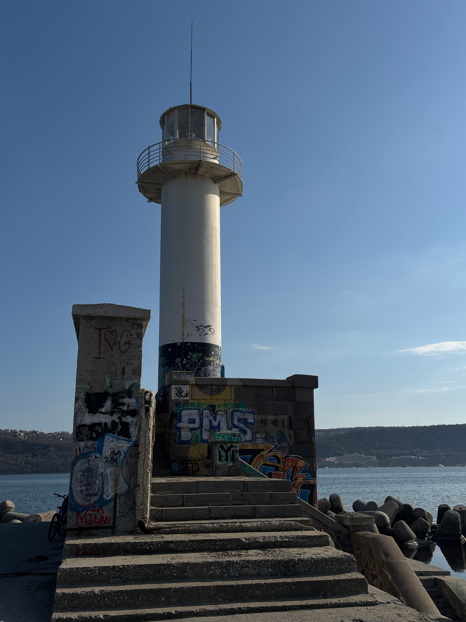 The image depicts a view of the Varna Lighthouse in Varna, Bulgaria, set against a clear blue sky. The lighthouse is a cylindrical white structure with a black band near its base and a metal cage surr…read more