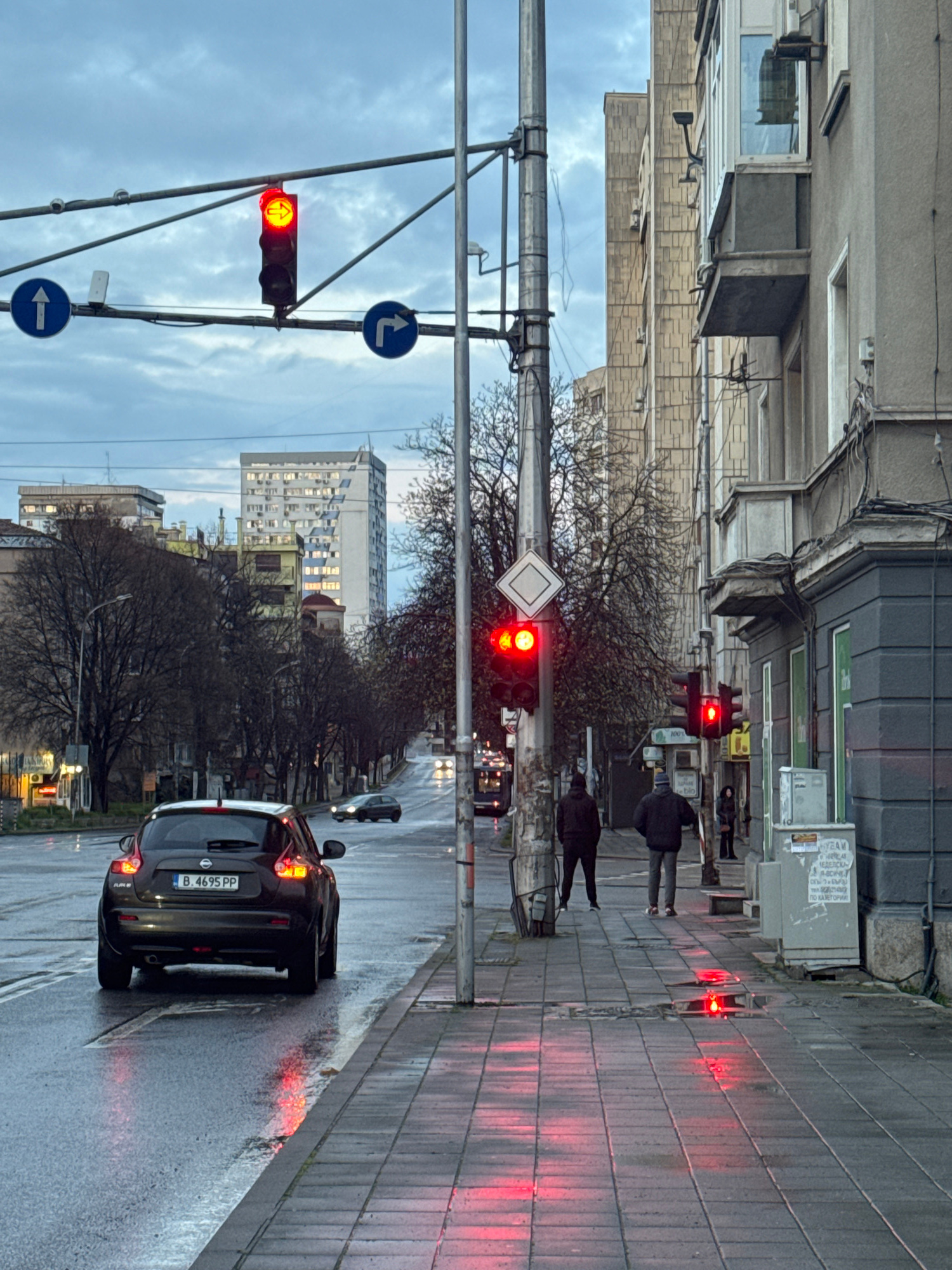 A street scene in Burgas, Bulgaria, shows a wet road surface reflecting red traffic lights. A dark-colored Nissan vehicle with license plate "B 4695 PP" is stopped in the right lane. Above the car is…read more