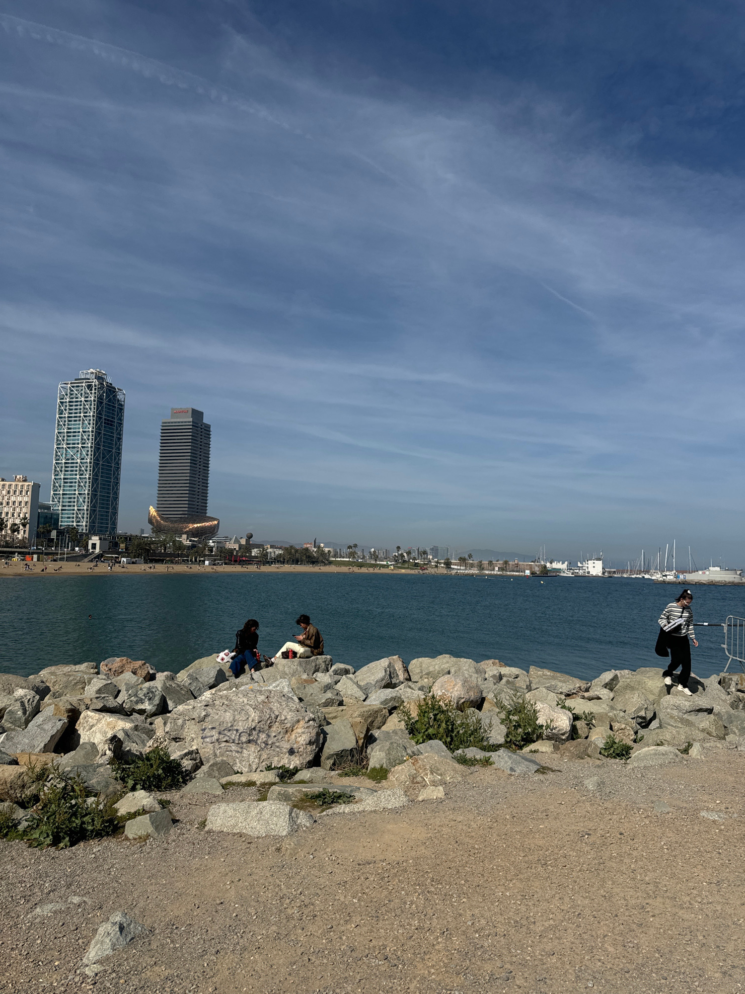 The image depicts a coastal scene in Barcelona, Spain, featuring the coastline and cityscape under a blue sky with wispy clouds. The shot is taken from a high vantage point along a rocky breakwater or…read more