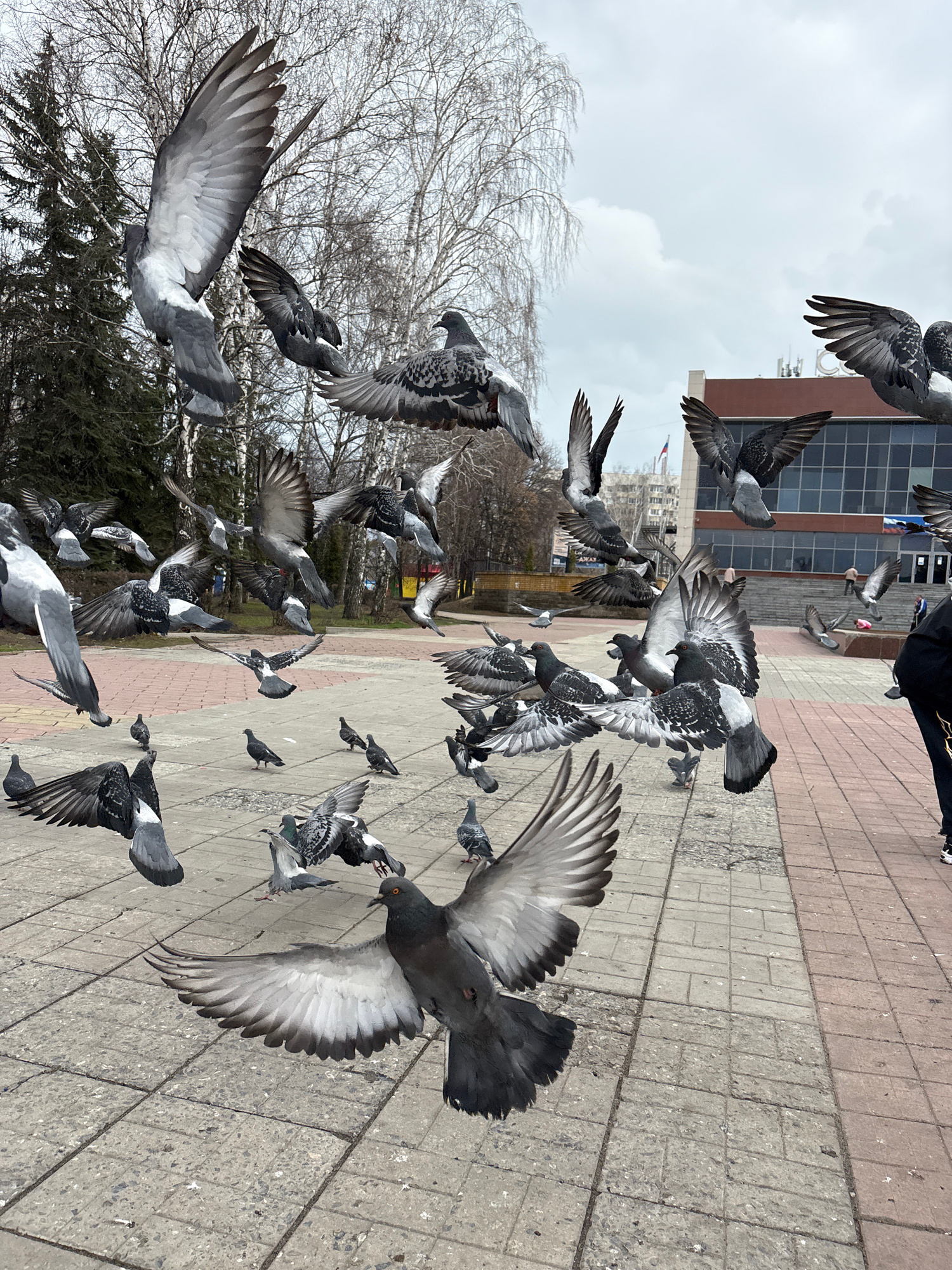 The image depicts a flock of pigeons in flight and on the ground in what appears to be a paved public square. Some pedestrians are present in the background. The building in the background with a glas…read more