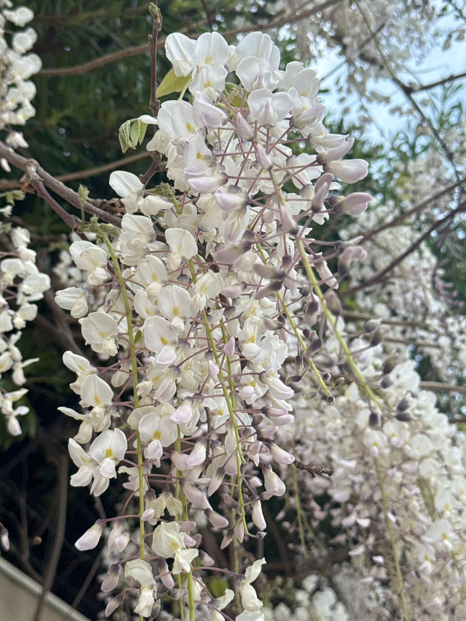 The image shows a close-up of white wisteria flowers blooming in Šušanj, Montenegro. The flowers are clustered on cascading branches, with some buds still closed. Green foliage is visible in the backg…read more
