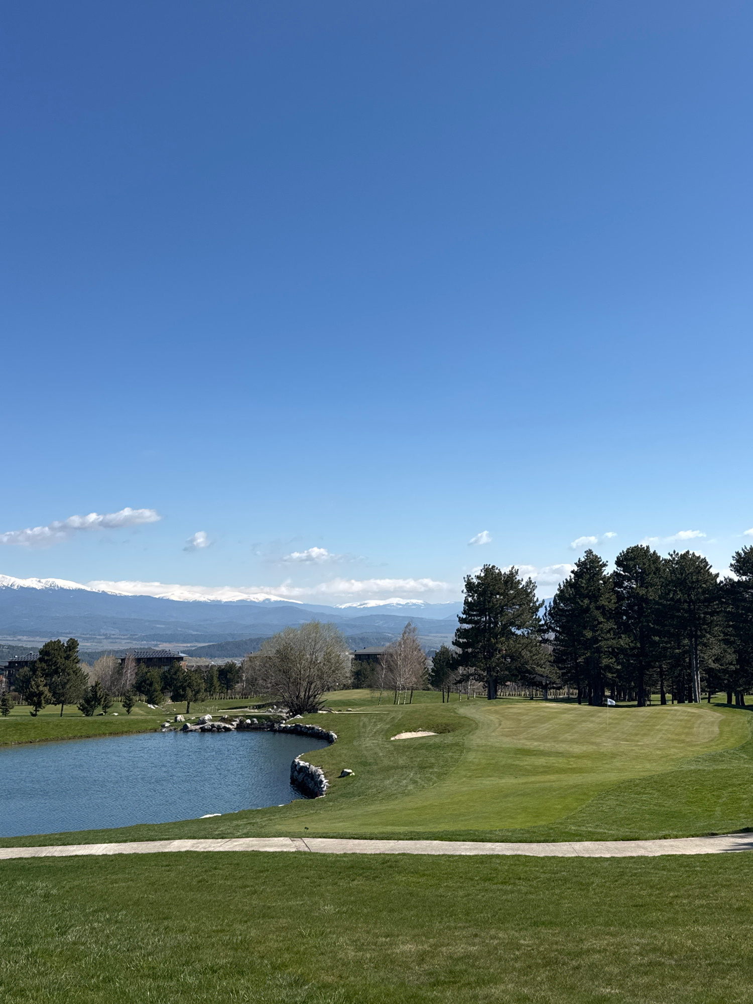 The image depicts a golf course with a water hazard on a sunny day in Razlog, Bulgaria. The fairway is lush green with a sand trap visible near the trees. A long, narrow pond bordered by rocks and lan…read more