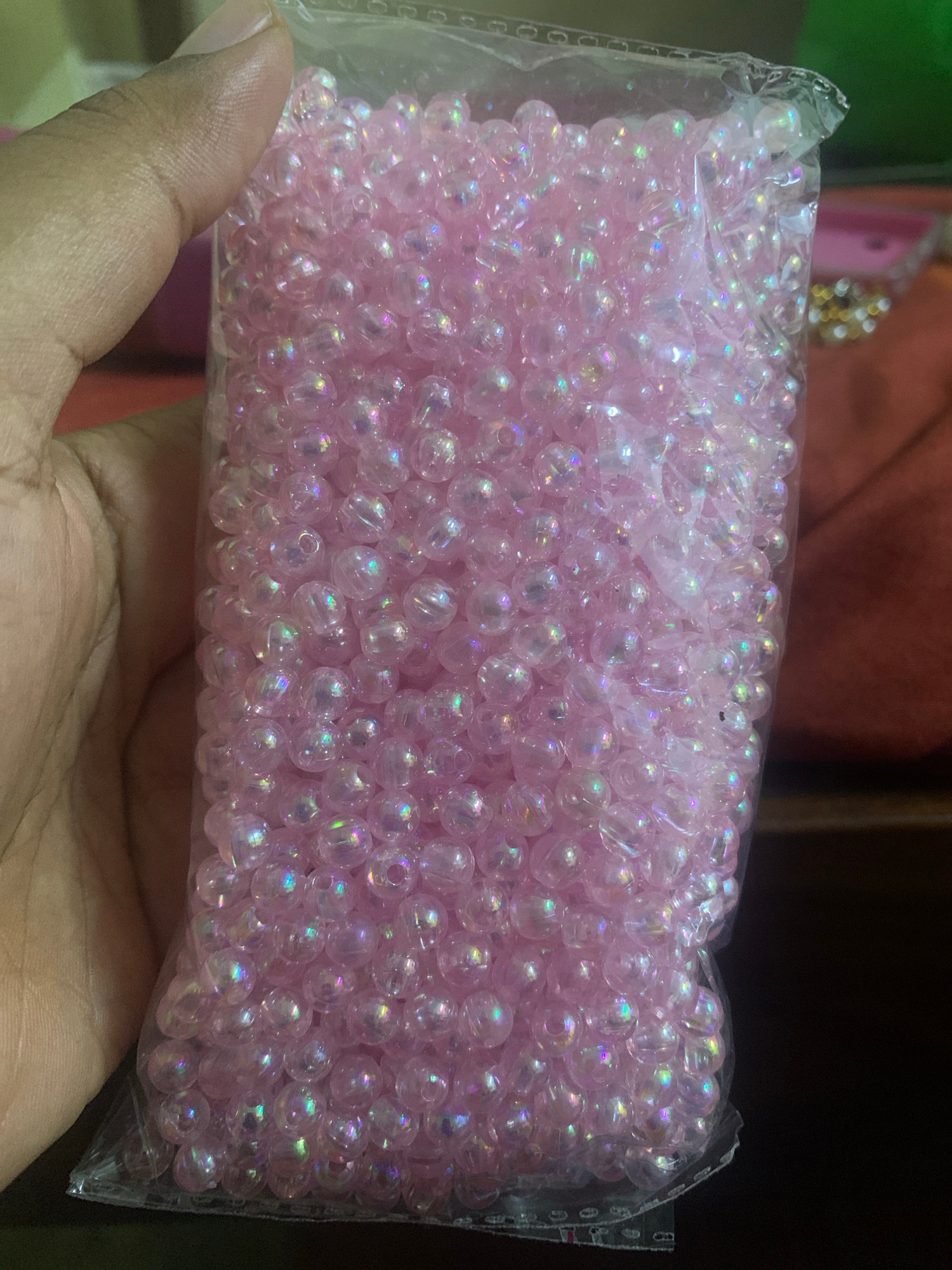 A clear plastic bag filled with numerous small, round, iridescent pink beads is held in a person's hand. The beads appear to be translucent and have a subtle, rainbow-like sheen. The background is sli…read more