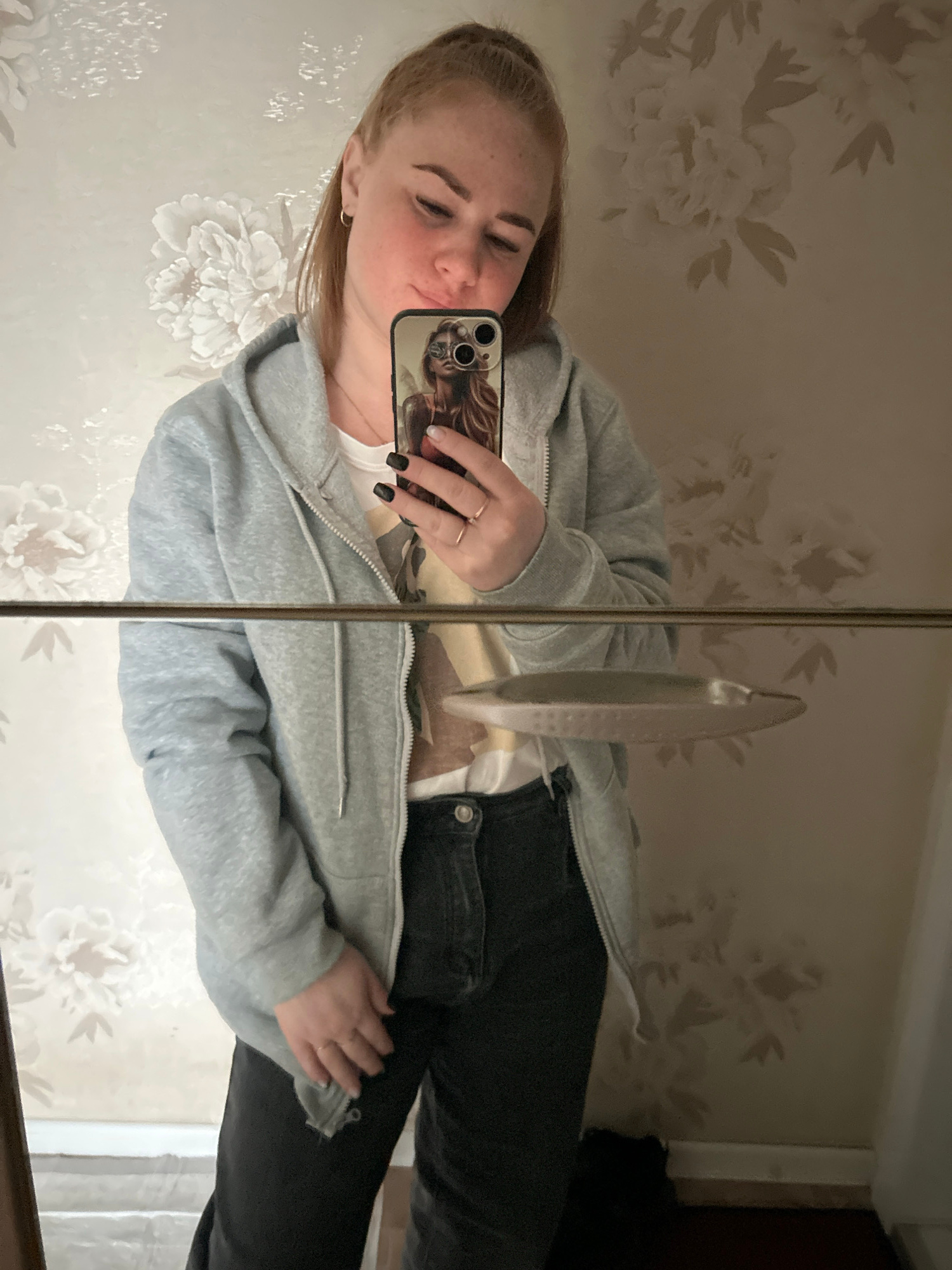 A young woman is taking a selfie in a mirror. She is wearing a gray zip-up hoodie over a white top, and dark jeans. She has fair skin and blond hair pulled back from her face. She is holding a phone i…read more