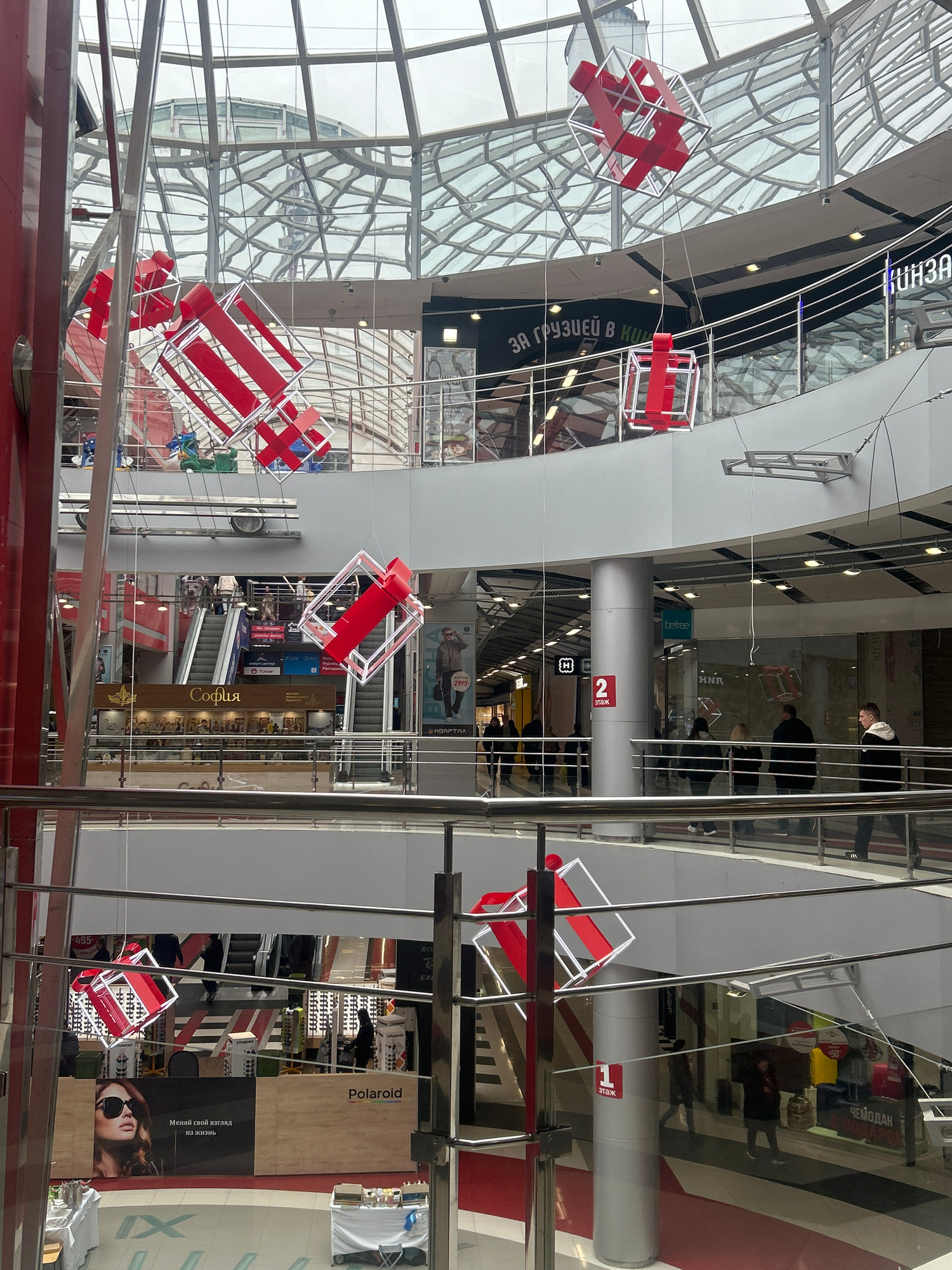 The image captures the interior of a shopping mall in Izhevsk, Russia. The space is characterized by multiple levels connected by escalators. Several geometric, red and white art installations hang fr…read more