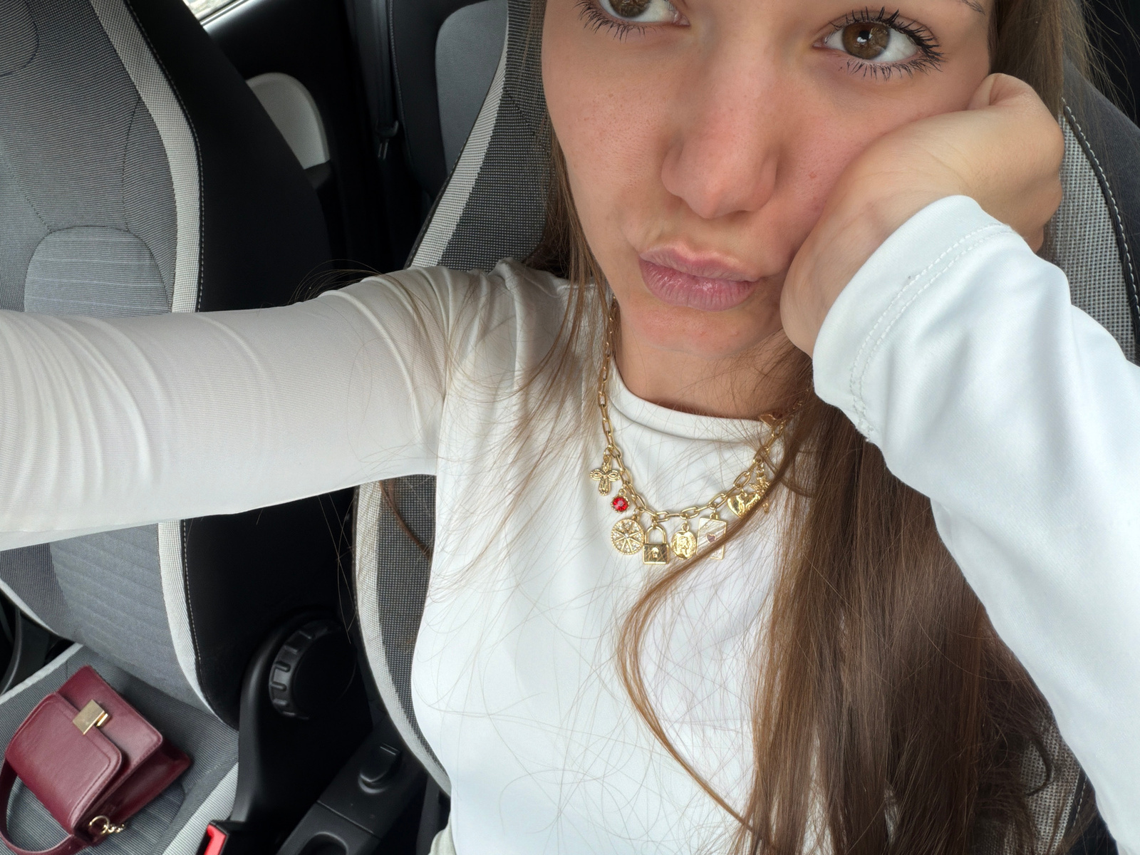A selfie photograph shows a woman inside a car. She is wearing a white, long-sleeved shirt and a gold charm necklace. Her hair is brown. Her face is partially obscured by her hand, and she is lookingβ¦read more