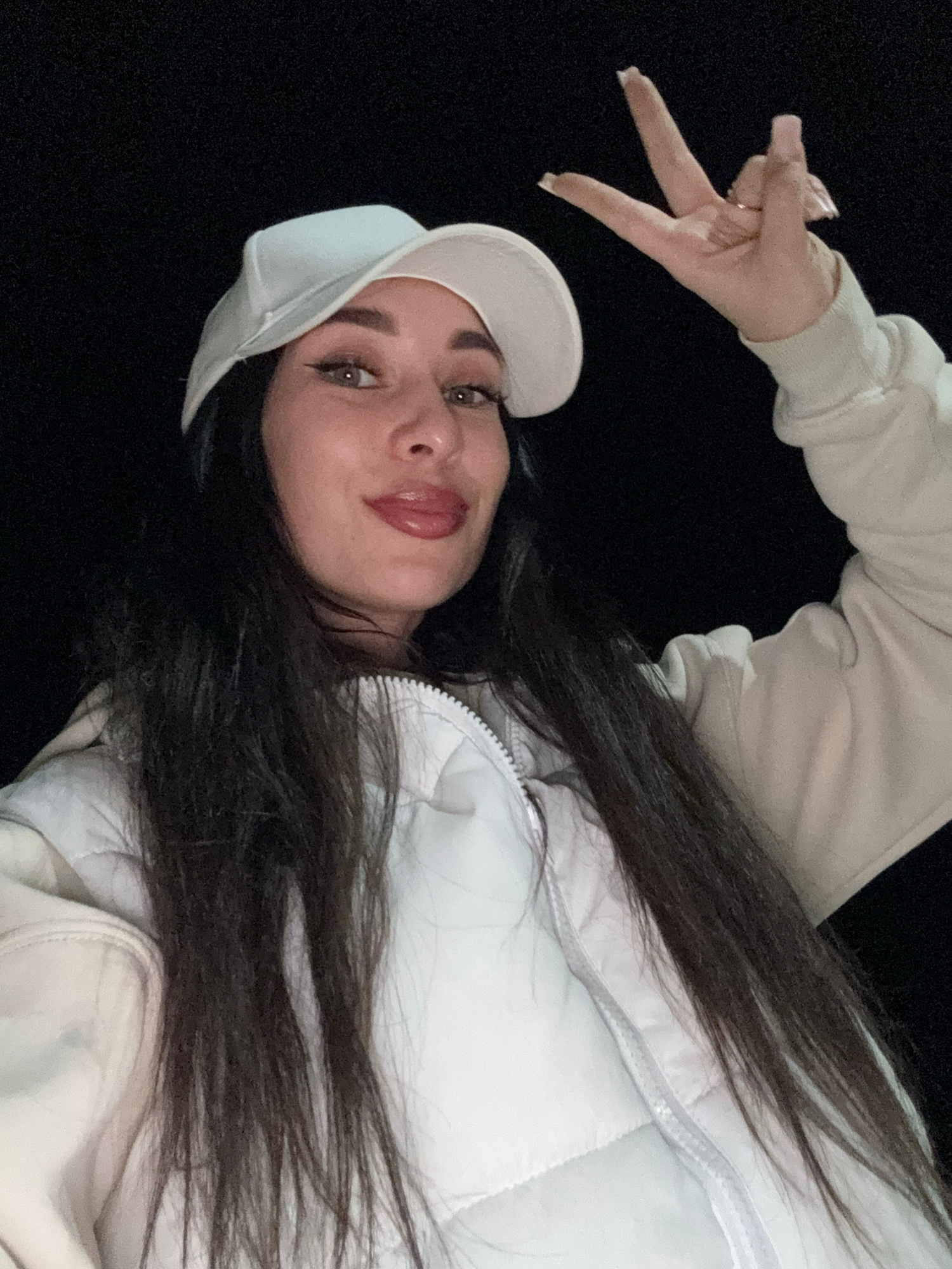 This close-up, angled selfie captures a young woman in Chaikovsky, Russia, against a solid black background, suggesting nighttime or a dark indoor setting. Her head is tilted, and she gazes directly a…read more