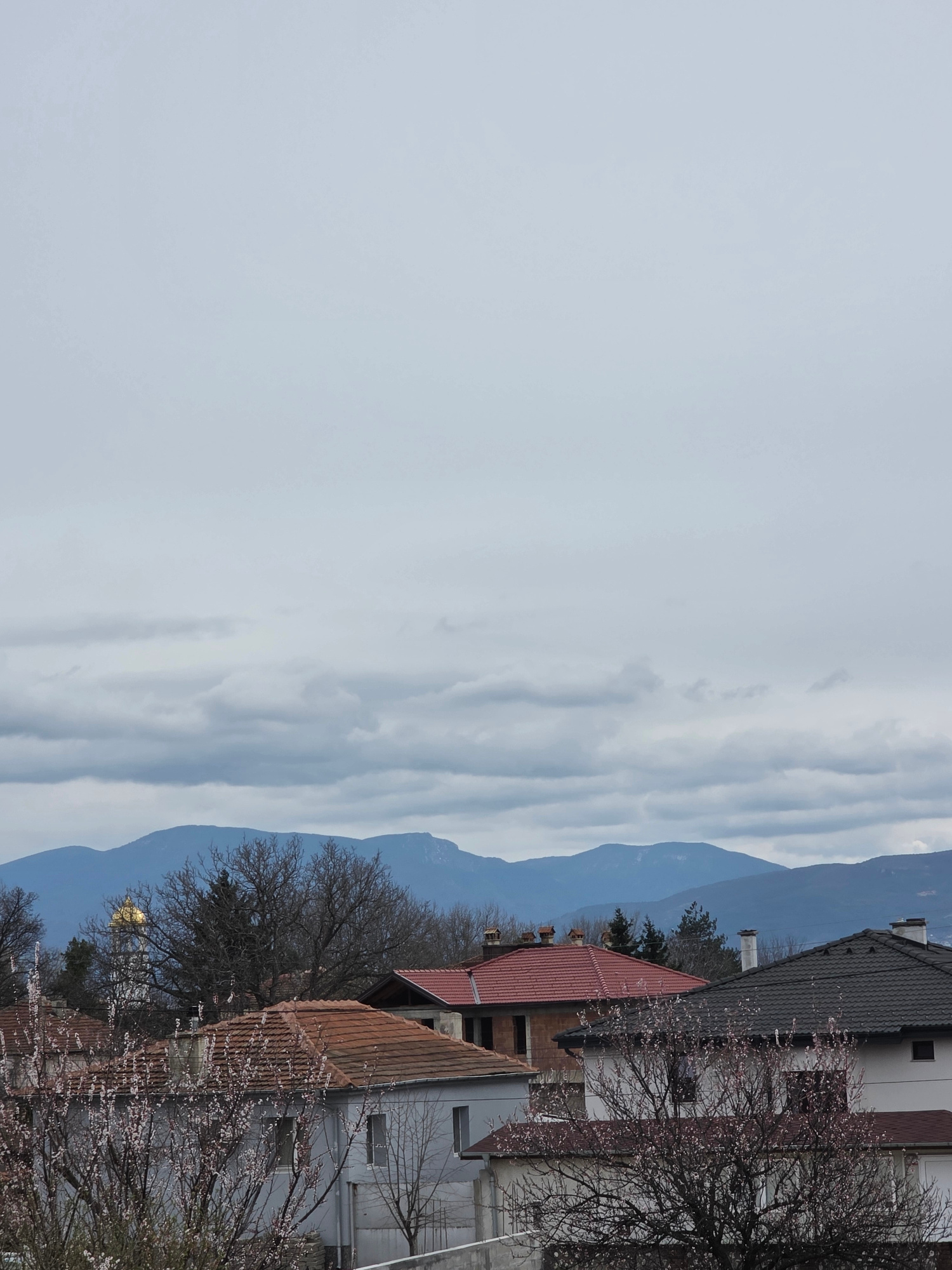 The image depicts a view in Yagodovo, Bulgaria. The sky is overcast with stratified cloud formations. In the mid-ground, a mountain range is visible. The foreground includes residential buildings with…read more