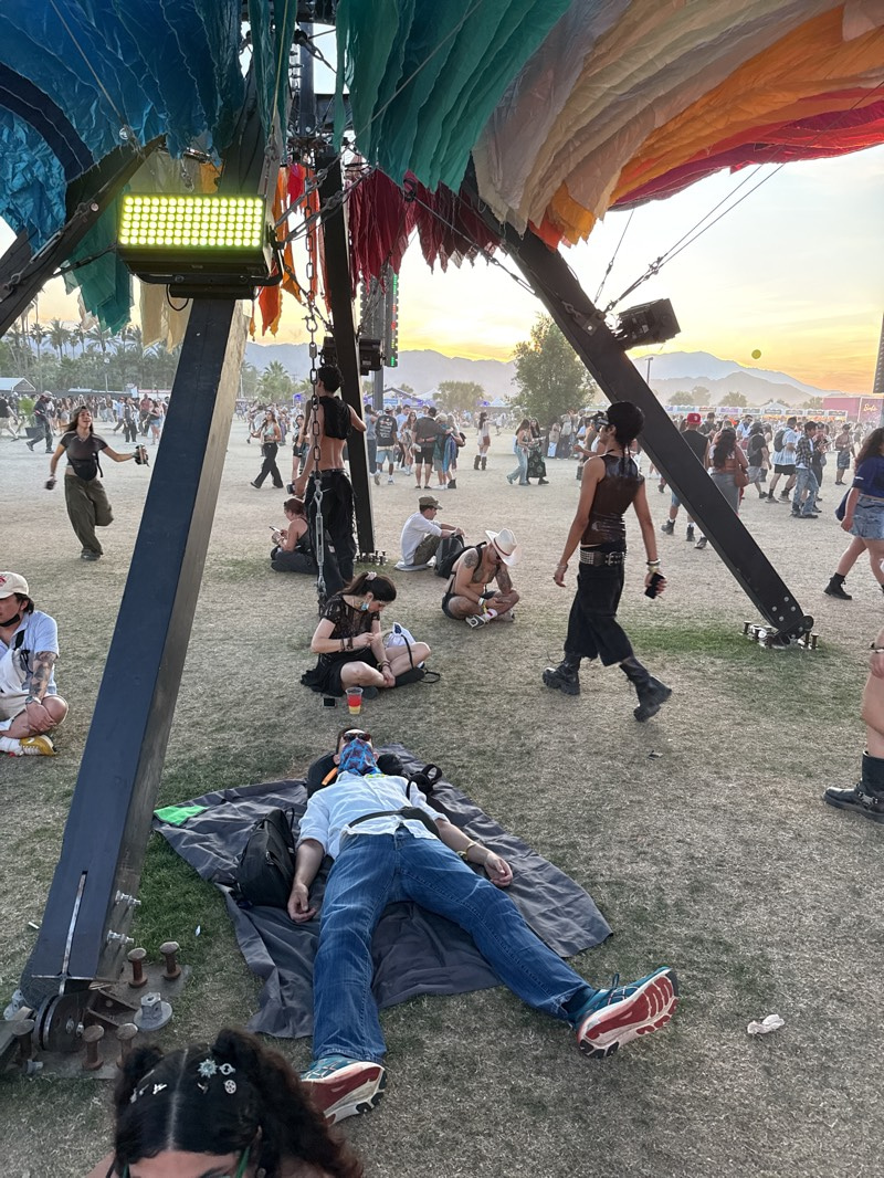 The image depicts a crowd of people at an outdoor event in Indio, United States. The location is a grassy area, possibly a park or festival ground, where some attendees are sitting or relaxing on the…read more