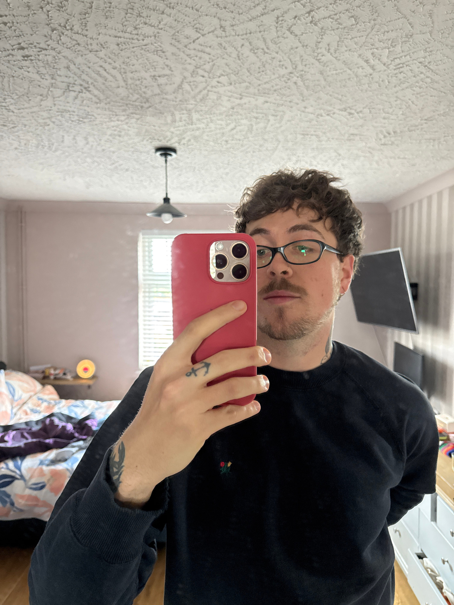 A man is taking a selfie with a red smartphone. He is wearing glasses and a black sweater with a small embroidered detail on the chest. A tattoo is visible on his hand. The background includes a textu…read more