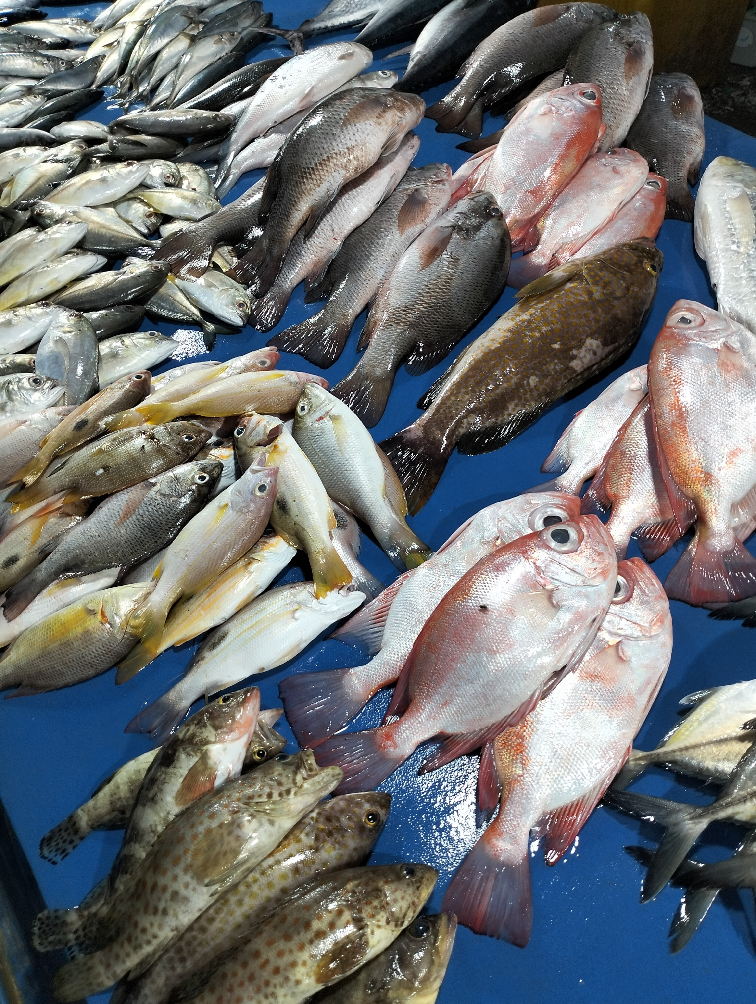 The image shows a variety of fish displayed on a blue surface, likely a table or stall, at a market in Lhokseumawe, Indonesia. The fish types vary, with some smaller silver fish in piles towards the…read more
