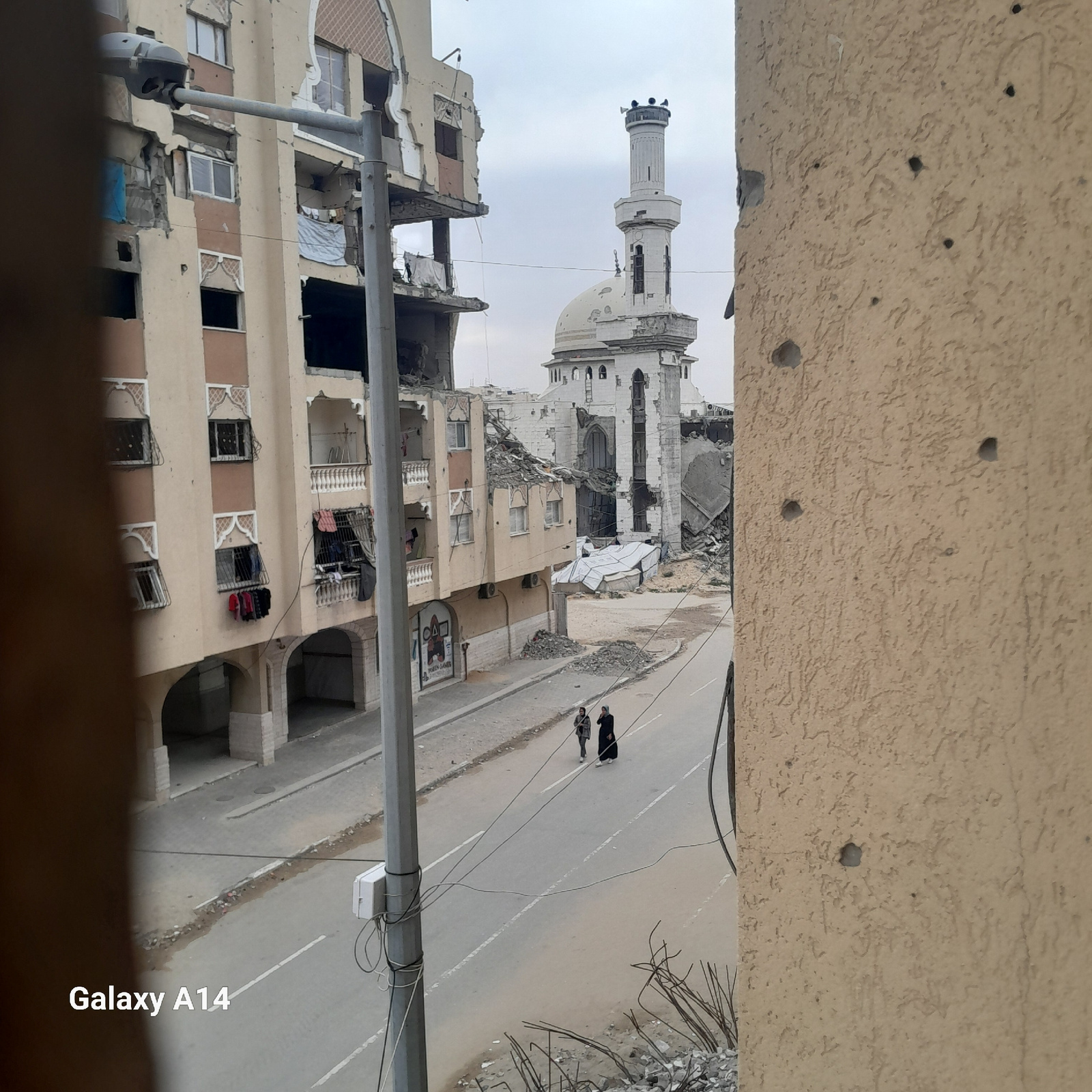 The image shows a scene of destruction in Khan Yunis, Palestinian Territory. A partially destroyed building is visible on the left side of the image, with significant damage to its facade and structur…read more