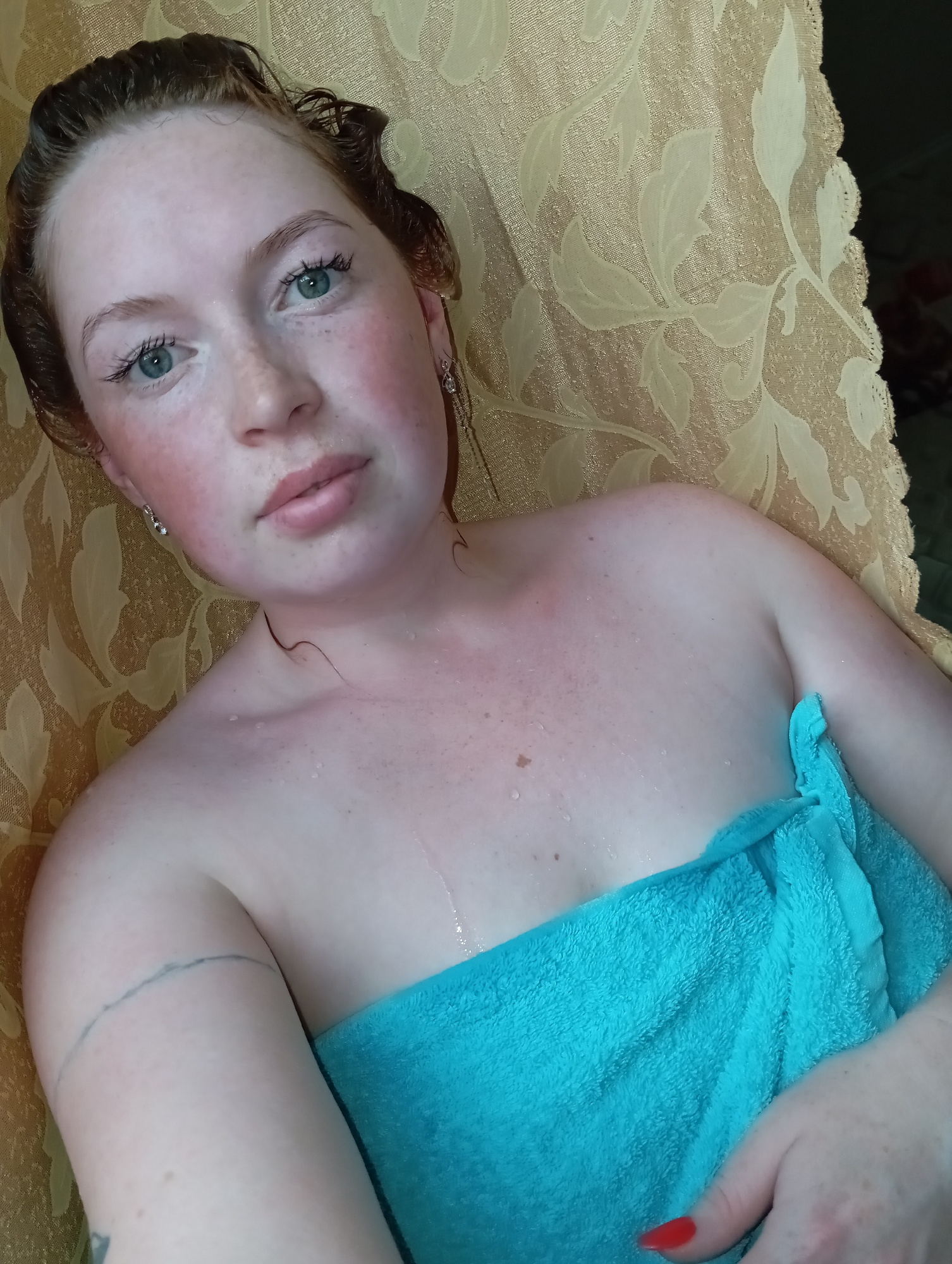 A fair-skinned person with wet brown hair and blue eyes is lying on a gold patterned surface. They are partially covered with a turquoise towel, held in place by a hand with red nail polish. The perso…read more