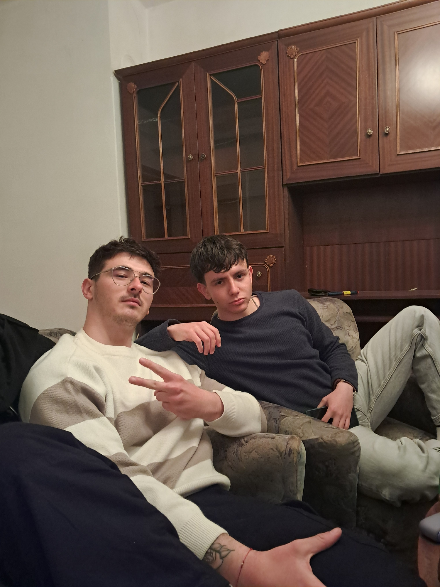 The image depicts three young men relaxing indoors. One man wears glasses and a striped sweater, displaying a peace sign. Another man wears a dark blue sweater. The third man is partially visible, wea…read more