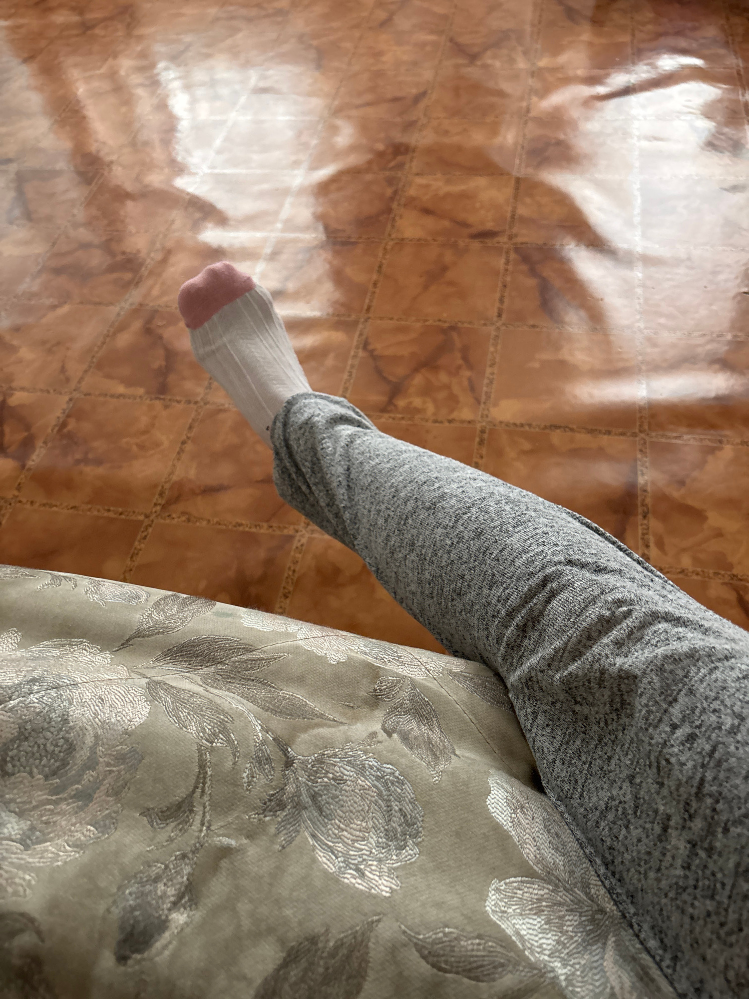 A person wearing gray clothing and a white sock with a pink toe is sitting on a floral-patterned cushion. The background is a brown tile floor with light reflections. The location cannot be determined…read more