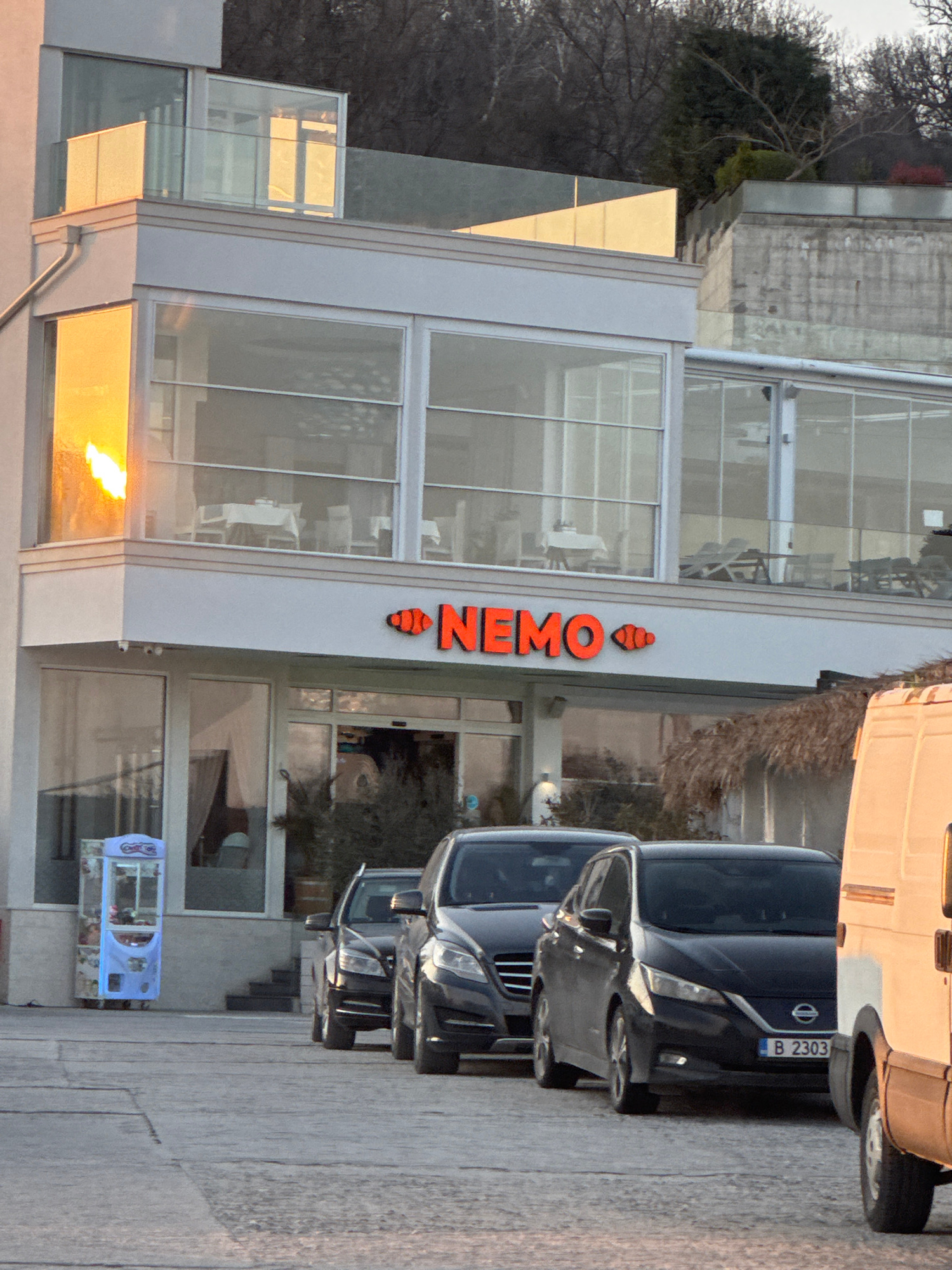 The image shows a business named "Nemo" in Varna, Bulgaria. The building has large glass windows, and the name "Nemo" is displayed vertically in orange lettering with an ice cream cone symbol above th…read more