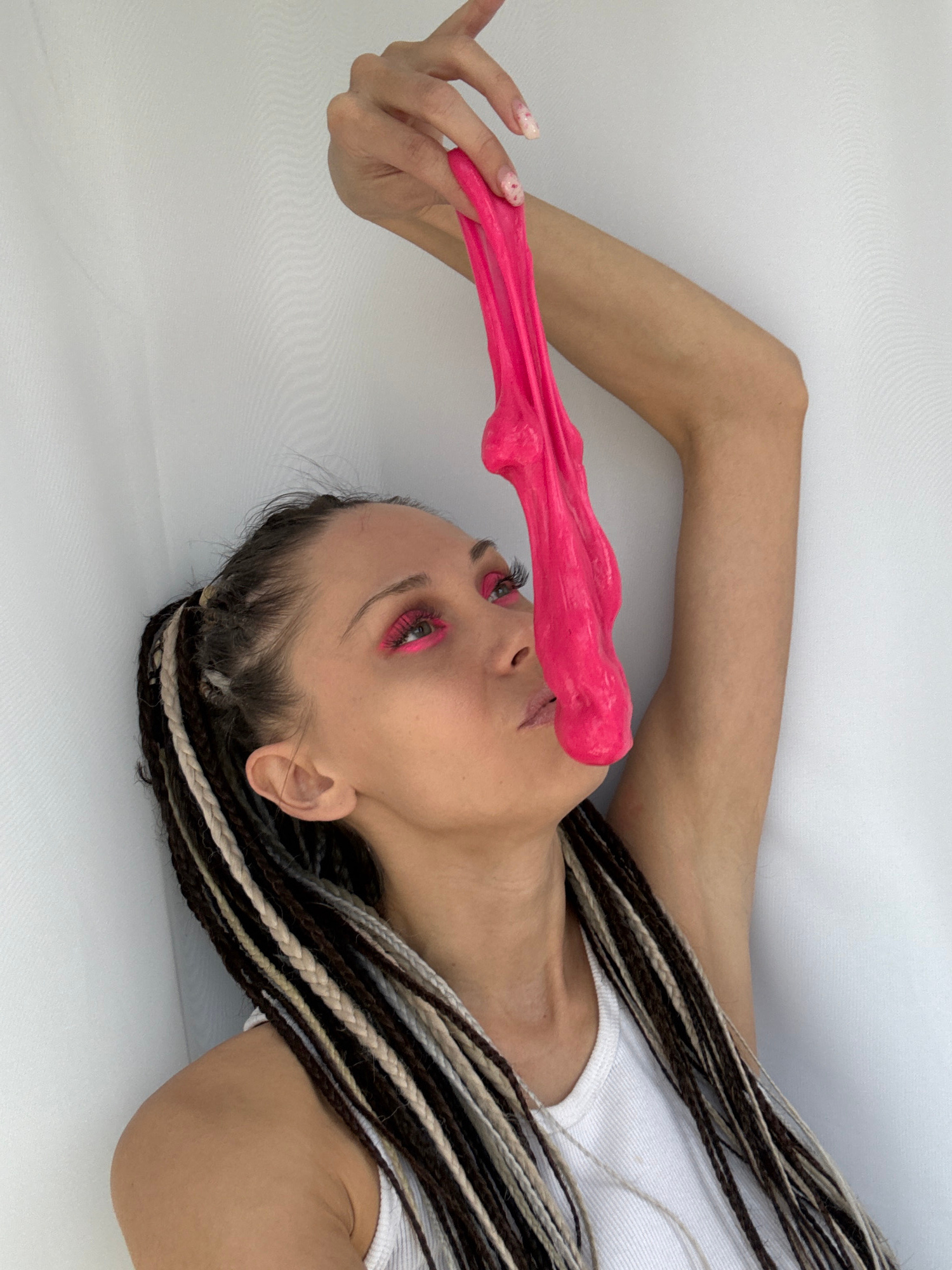 A woman with brown and blonde braided hair, wearing a white tank top, lies against a white background. She holds a piece of pink slime that stretches from her hand to her face, covering her nose. Sheβ¦read more