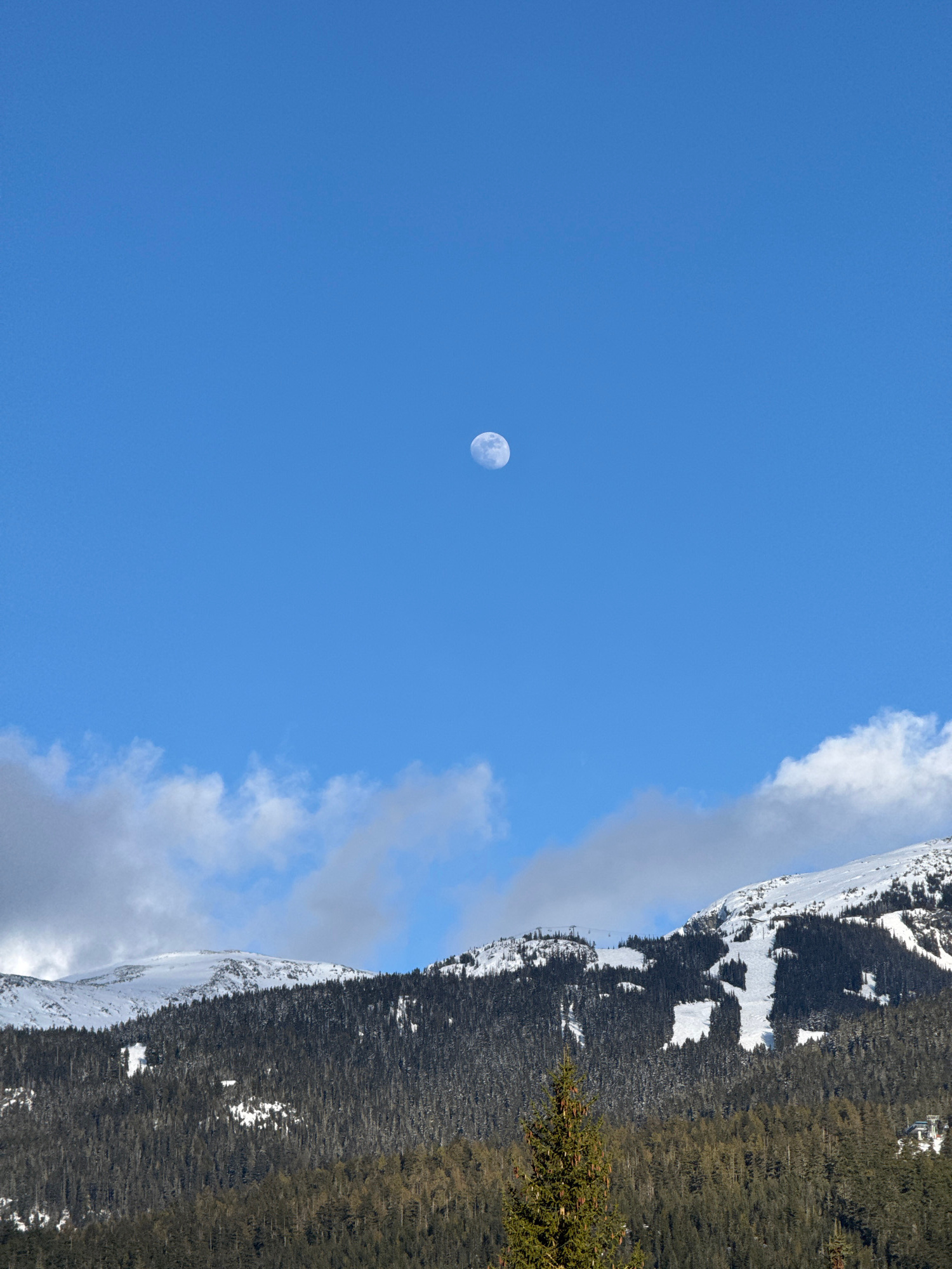 The image shows a partly cloudy sky with the moon visible, along with a snow-covered mountain slope in Whistler, Canada. The sky is a clear blue, with some wispy clouds near the mountain. The mountain…read more