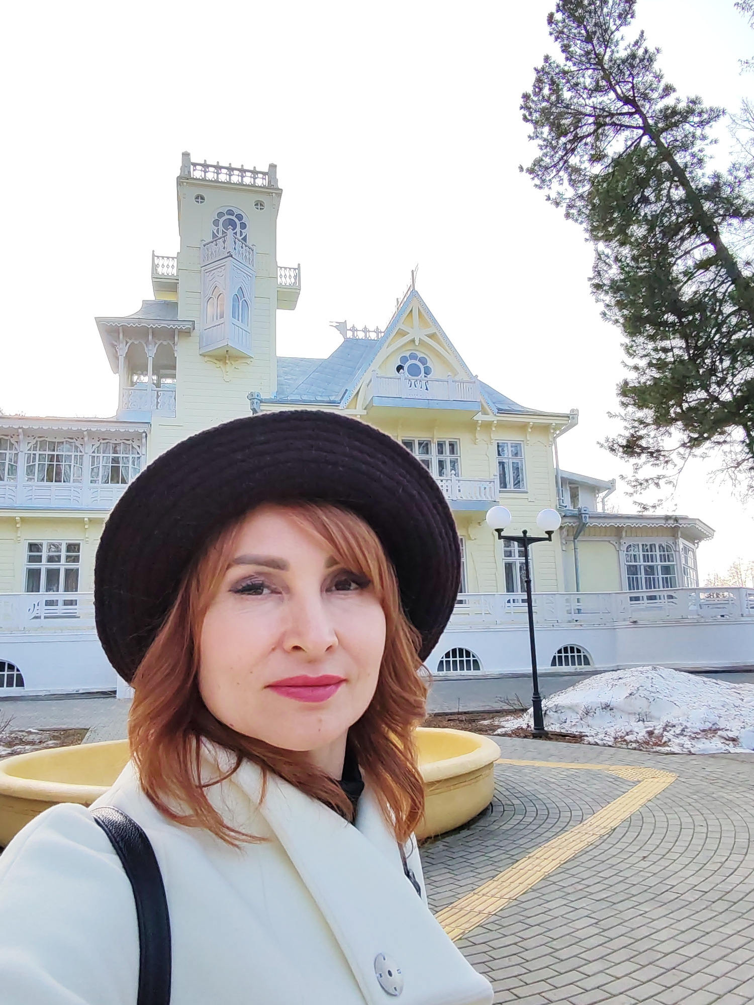 A selfie features a woman with auburn hair wearing a black hat and a white coat with a black shoulder bag. She is positioned in front of a yellow building featuring ornate architectural details, inclu…read more
