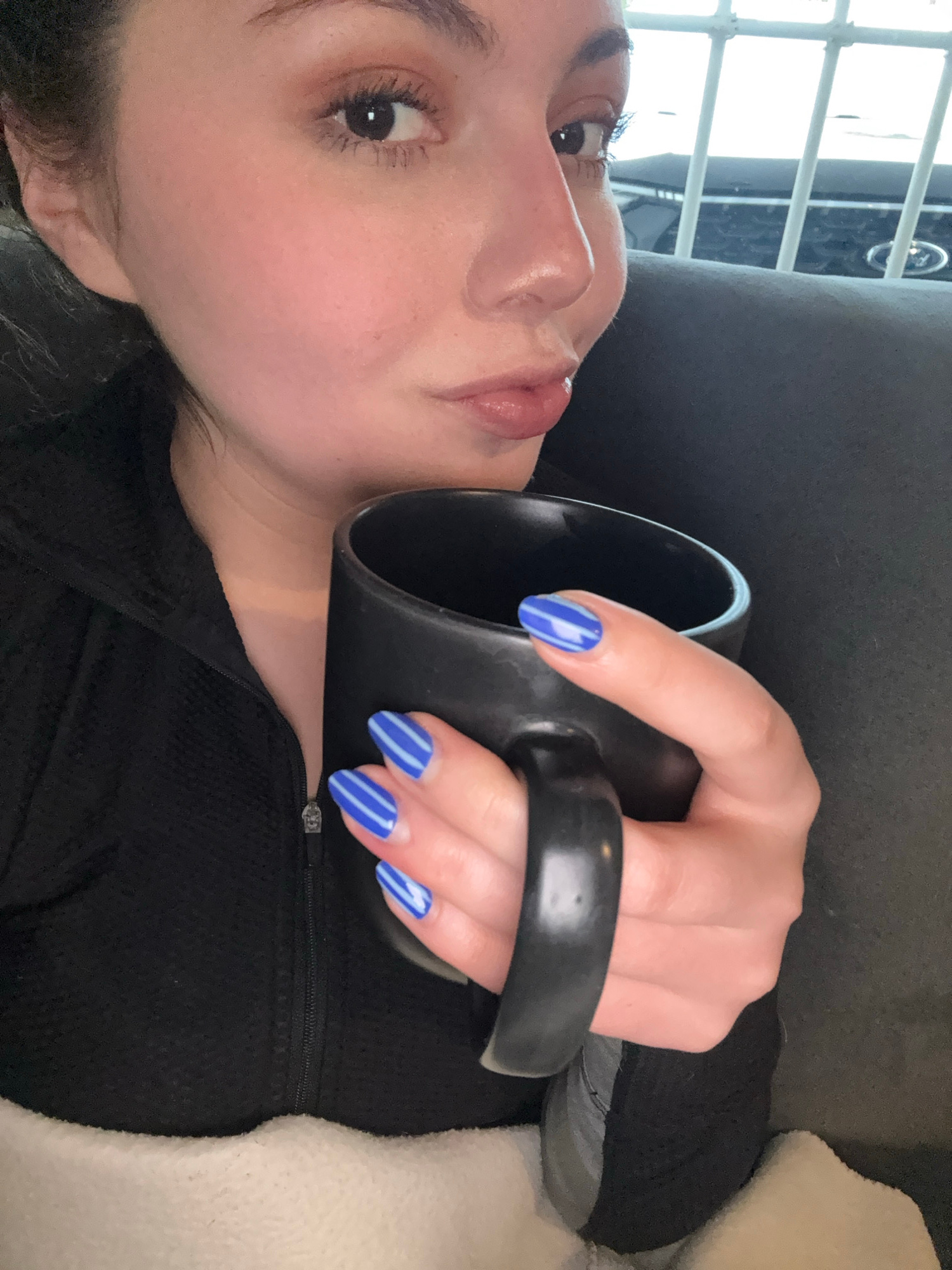 A selfie of a woman with light skin holding a black mug, presumably containing a beverage, is oriented vertically with the woman's face in the lower left quadrant of the frame. Her nails are painted b…read more
